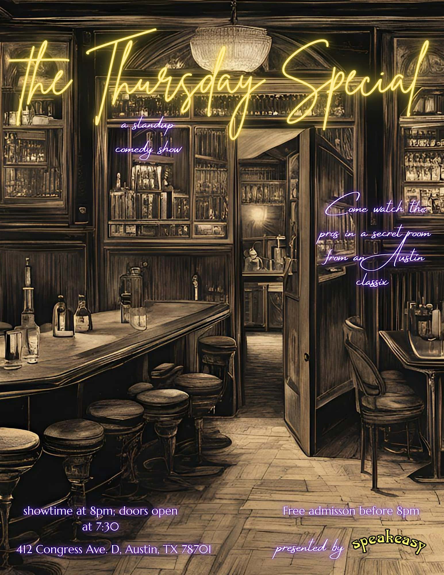 by admin14Feb The Thursday Special at Speakeasy – Austin, TX The Thursday Special at Speakeasy – Austin, TX 1 1 people viewed this event. Join us for The Thursday Special, a lively stand up comedy show where pros work out new material from a hidden room in an Austin original. Tickets-RSVP Link Date And Time Friday, April 10th, 2026 01:00 AM (PST) Venue Speakeasy Location 412 Congress Avenue, Austin, TX 78701 Event Types Concert or PerformanceFilm, Media & Entertainment Event Category AustinTexas Share With Friends Facebook Twitter Linkedin Xing Pinterest Share This Post:
