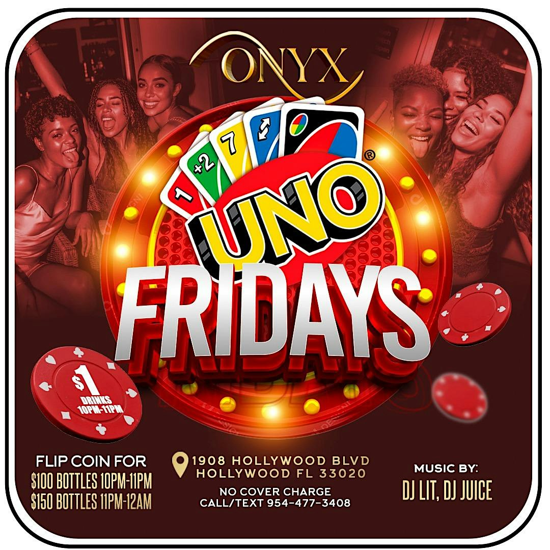 by admin27Feb Uno Fridays at Onyx Lounge – Hollywood, FL Uno Fridays at Onyx Lounge – Hollywood, FL 2 2 people viewed this event. bragging rights! when you flip the coin to win a chance to pay $100 for any bottle. and $1 drinks till 11PM Tickets-RSVP Link Date And Time Friday, April 10th, 2026 09:00 PM (PST) Venue Onyx Lounge Location 1908 Hollywood Boulevard, Hollywood, FL 33020 Event Types Food & DrinkParty or Social Gathering Event Category Florida Share With Friends Facebook Twitter Linkedin Xing Pinterest Share This Post: