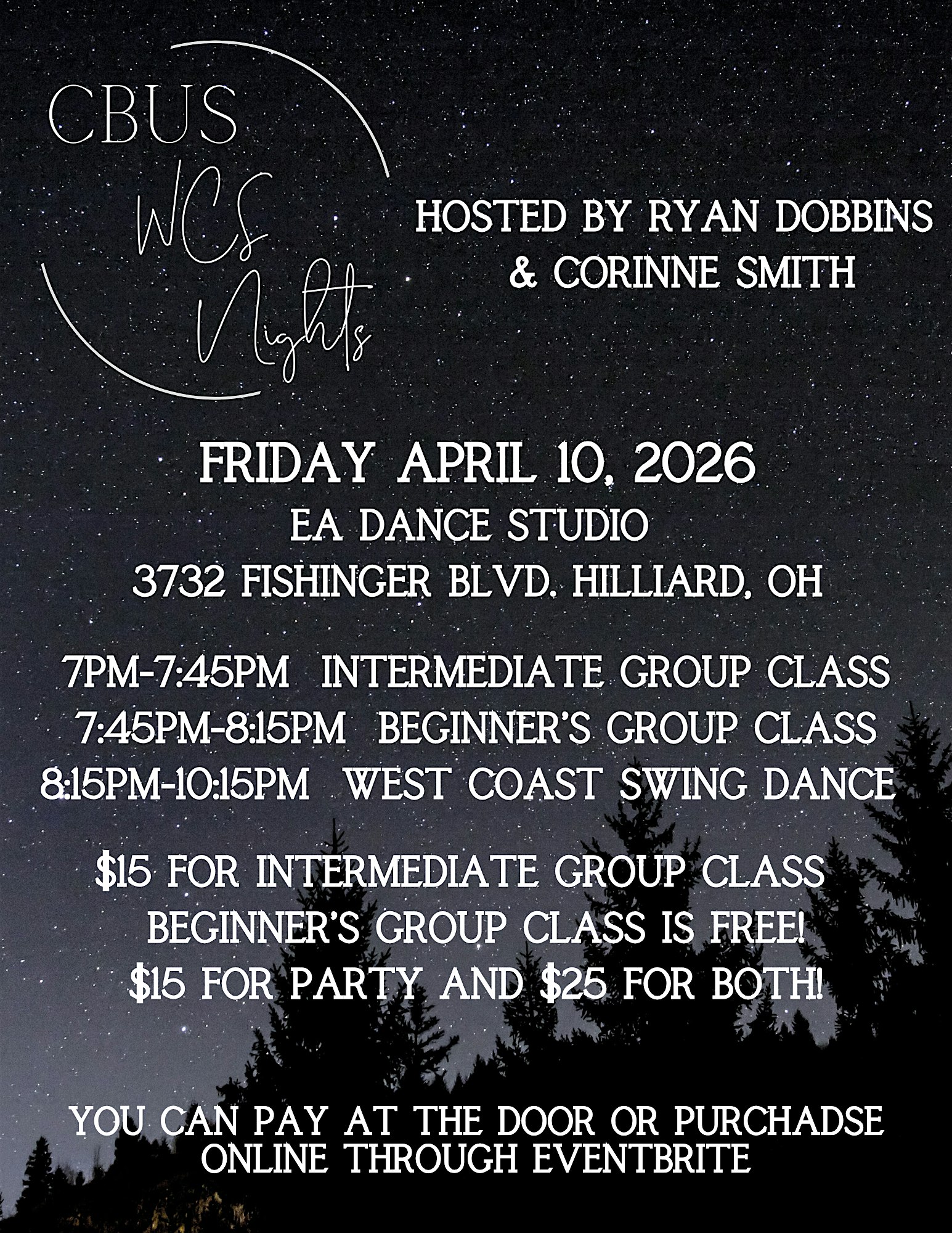 by admin27Feb West Coast Swing Night at EA Dance Art – Hilliard, OH West Coast Swing Night at EA Dance Art – Hilliard, OH 2 2 people viewed this event. Corinne of Ballroom Avenue and Ryan Dobbins are hosting a West Coast Swing event in Columbus, OH! Tickets-RSVP Link Date And Time Friday, April 10th, 2026 @ 07:00 PM Location 3732 Fishinger Boulevard, Hilliard, OH 43026 Event Types Party or Social Gathering Event Category Ohio Share With Friends Facebook Twitter Linkedin Xing Pinterest Share This Post: