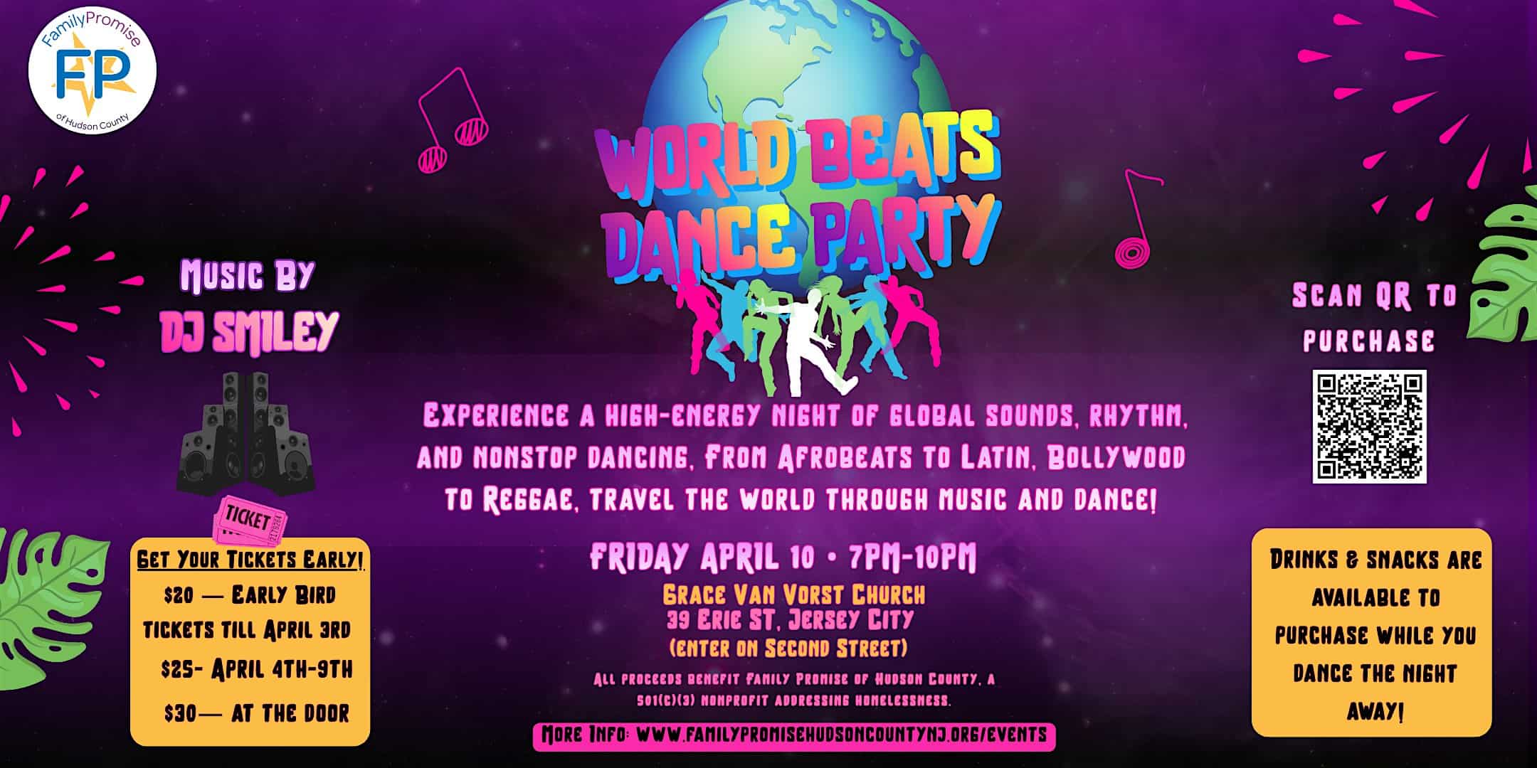 by admin23Feb World Beats Dance Party at Grace Church Van Vorst – Jersey City, NJ World Beats Dance Party at Grace Church Van Vorst – Jersey City, NJ 2 2 people viewed this event. Join us for an energetic and unforgettable World Beats Dance Party hosted by Family Promise of Hudson County! Tickets-RSVP Link Date And Time Friday, April 10th, 2026 07:00 PM (PST) Venue Grace Church Van Vorst Location 39 Erie Street, Jersey City, NJ 7302 Event Types MusicParty or Social Gathering Event Category New Jersey Share With Friends Facebook Twitter Linkedin Xing Pinterest Share This Post: