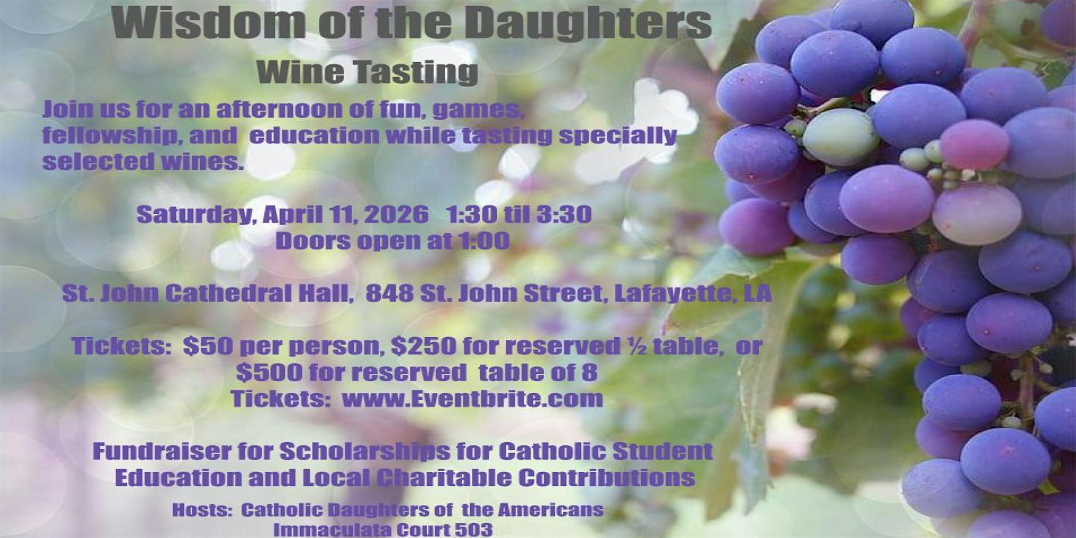 by admin13Feb 2026 Wisdom of the Daughters at 848 St John St – Lafayette, LA 2026 Wisdom of the Daughters at 848 St John St – Lafayette, LA 2 2 people viewed this event. Fun women’s event with wine tasting, food pairing, and education to encourage community and spiritual enrichment. Advanced tickets advised. Tickets-RSVP Link Date And Time Saturday, April 11th, 2026 06:00 PM (PST) Venue 848 St John St Location 848 Saint John Street, Lafayette, LA 70501 Event Types Charity & CausesParty or Social Gathering Event Category Louisiana Share With Friends Facebook Twitter Linkedin Xing Pinterest Share This Post: