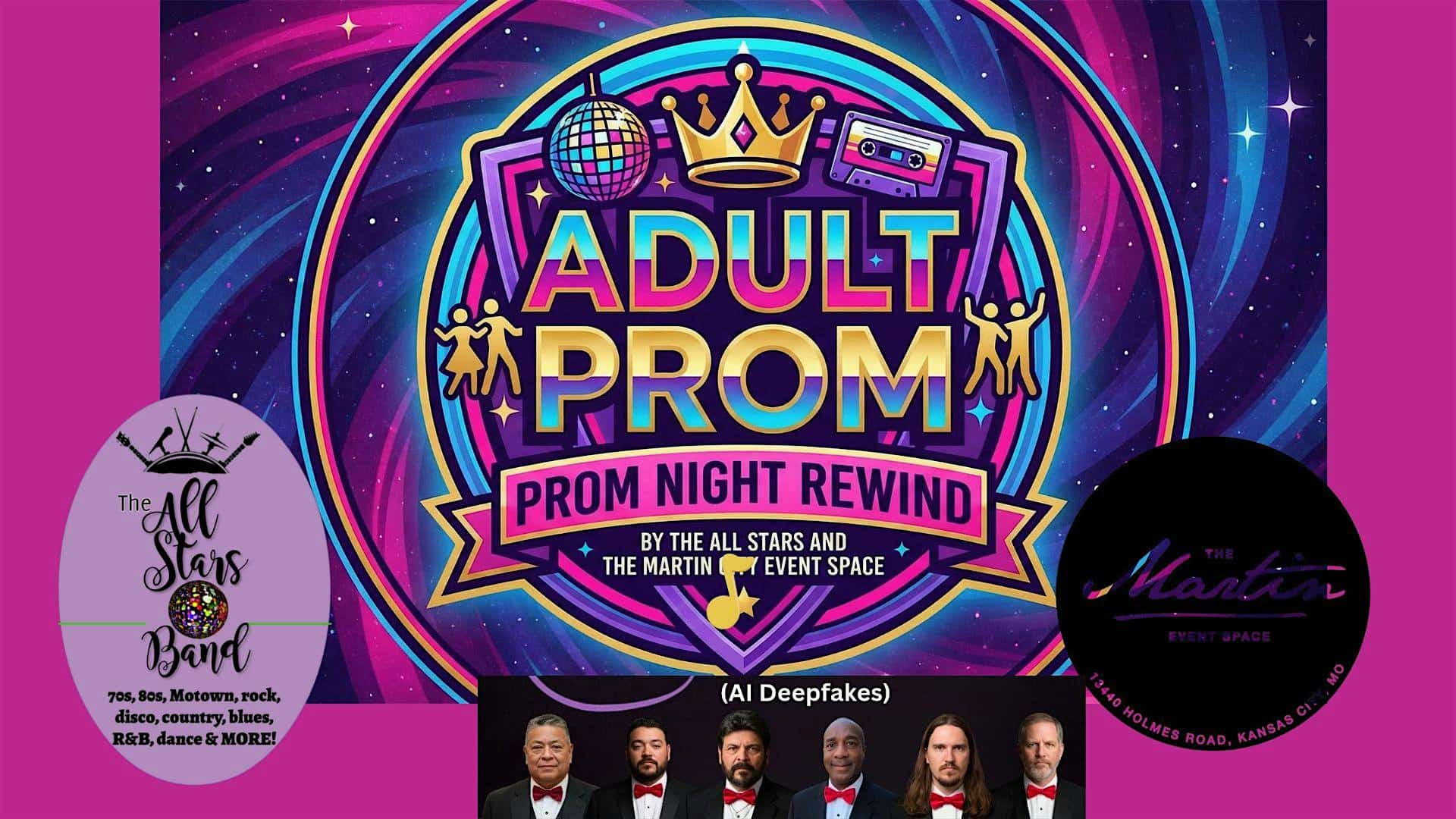 by admin23Feb Adult Prom Dance Party Featuring Live Performance by the All Stars Band at The Martin Event Space – Kansas City, MO Adult Prom Dance Party Featuring Live Performance by the All Stars Band at The Martin Event Space – Kansas City, MO 3 3 people viewed this event. Get ready to dance the night away at our Adult Prom Dance Party with an incredible live performance by the All Stars Band! Tickets-RSVP Link Date And Time Saturday, April 11th, 2026 07:00 PM (PST) Venue The Martin Event Space Location 13440 Holmes Road, Kansas City, MO 64145 Event Types MusicParty or Social Gathering Event Category Kansas CityMissouri Share With Friends Facebook Twitter Linkedin Xing Pinterest Share This Post: