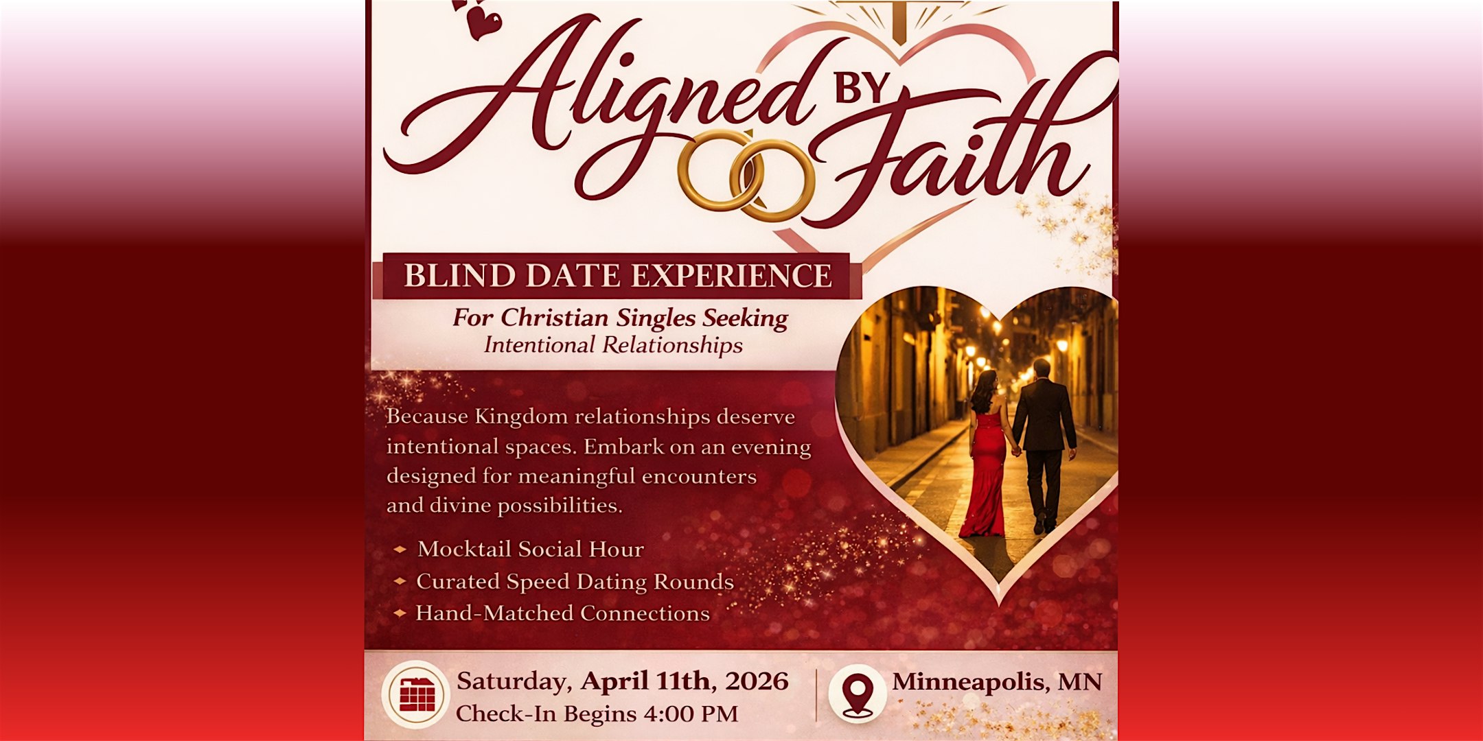 Join us for the first Aligned By Faith Blind Date Experience, an evening created for Christian singles who desire intentional, faith-centered connections.