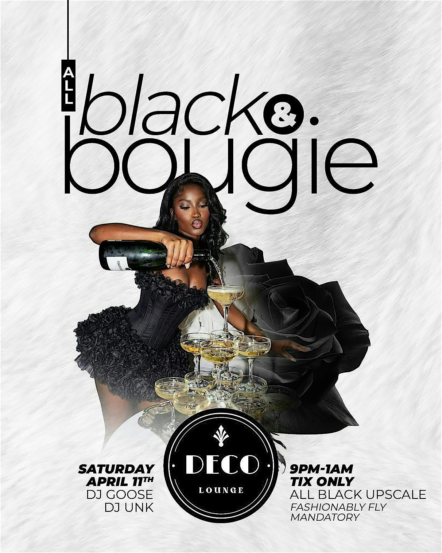 Saturday April 11, 2026 inside of Deco Lounge… Join us for All Black & Bougie. We need your Finest and Flyest all Black Attire. This is not the party for your sweatsuits. This is the Party for that Outfit that you know is going to turn necks and stop traffic.