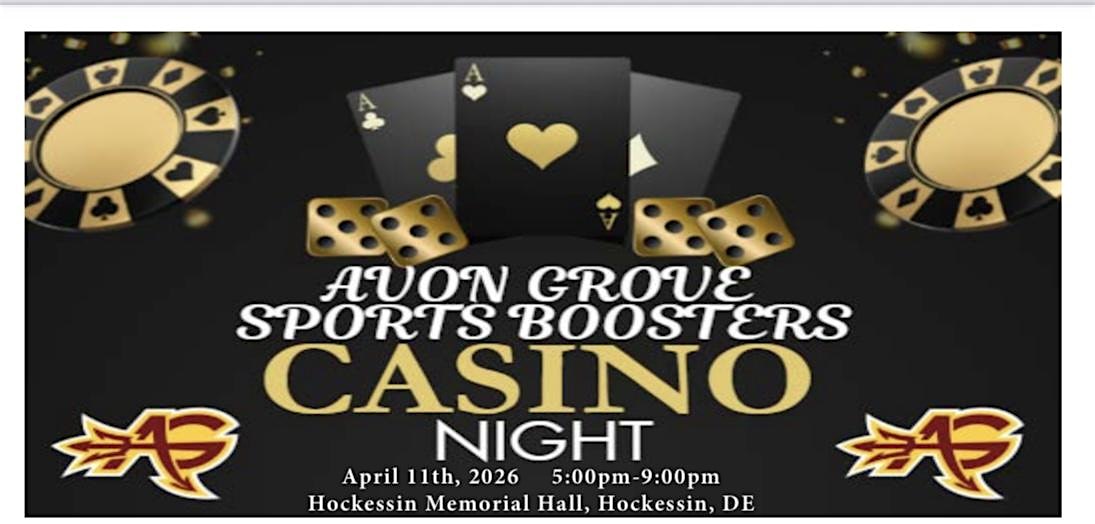 by admin13Feb Avon Grove Sports Boosters CASINO NIGHT at Hockessin Memorial Hall – Hockessin, DE Avon Grove Sports Boosters CASINO NIGHT at Hockessin Memorial Hall – Hockessin, DE 1 1 people viewed this event. Join us for a fun-filled night of games, prizes, and good vibes at Avon Grove Sports Boosters Casino Night! Tickets-RSVP Link Date And Time Saturday, April 11th, 2026 09:00 PM (PST) Venue Hockessin Memorial Hall Location 610 Yorklyn Road, Hockessin, DE 19707 Event Types Party or Social GatheringSports & Fitness Event Category Delaware Share With Friends Facebook Twitter Linkedin Xing Pinterest Share This Post: