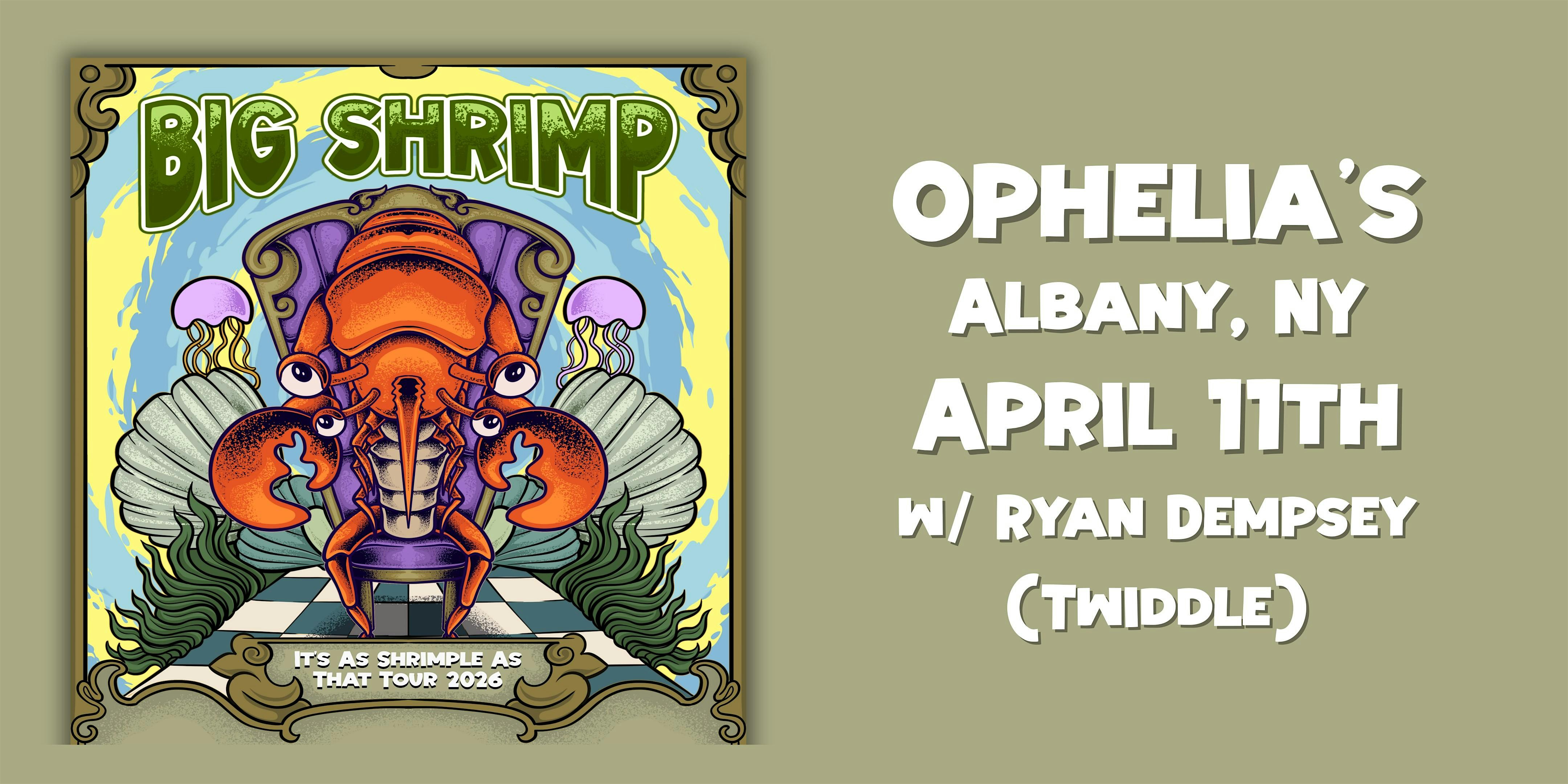 by admin24Feb Big Shrimp w/ Ryan Dempsey (of Twiddle) at Ophelia’s at Ophelia’s – Albany, NY Big Shrimp w/ Ryan Dempsey (of Twiddle) at Ophelia’s at Ophelia’s – Albany, NY 1 1 people viewed this event. Big Shrimp brings their It’s As Shrimple As That Tour to Ophelia’s in Albany, NY on April 11th w/ special guest: Ryan Dempsey of Twiddle! Tickets-RSVP Link Date And Time Saturday, April 11th, 2026 09:00 PM (PST) Venue Ophelia's Location 388 Broadway, Albany, NY 12207 Event Types Concert or PerformanceMusic Event Category New York Share With Friends Facebook Twitter Linkedin Xing Pinterest Share This Post: