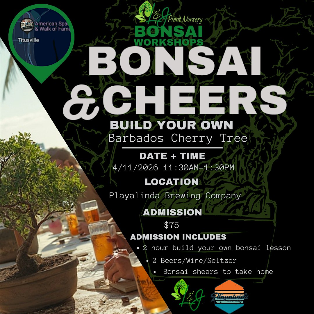 by admin24Feb Bonsai & Cheers – Playalinda – L&J Nursery -Barbados Cherry Tree at Playalinda Brewing Company – Titusville, FL Bonsai & Cheers – Playalinda – L&J Nursery -Barbados Cherry Tree at Playalinda Brewing Company – Titusville, FL 2 2 people viewed this event. We’re back at Playalinda Brewing with a brand-new format — now two full hours of bonsai building, education, and fun! ✨ Tickets-RSVP Link Date And Time Saturday, April 11th, 2026 11:00 AM (PST) Venue Playalinda Brewing Company Location 5220 South Washington Avenue, Titusville, FL 32780 Event Types Food & Drink Event Category Florida Share With Friends Facebook Twitter Linkedin Xing Pinterest Share This Post: