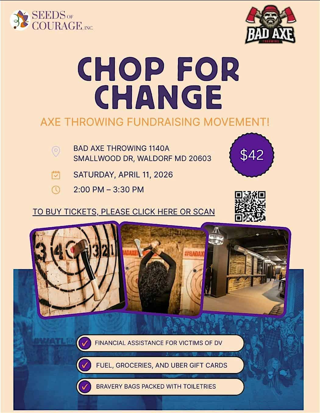 by admin14Feb Chop for Change at Bad Axe Throwing Waldorf – Waldorf, MD Chop for Change at Bad Axe Throwing Waldorf – Waldorf, MD 3 3 people viewed this event. Chop for Change provides financial assistance for victims of domestic violence, including support for fuel, groceries, & Uber gift cards Tickets-RSVP Link Date And Time Saturday, April 11th, 2026 06:00 PM (PST) Venue Bad Axe Throwing Waldorf Location 1140A Smallwood Drive, Waldorf, MD 20603 Event Types Charity & CausesParty or Social Gathering Event Category MarylandNational Harbor Share With Friends Facebook Twitter Linkedin Xing Pinterest Share This Post: