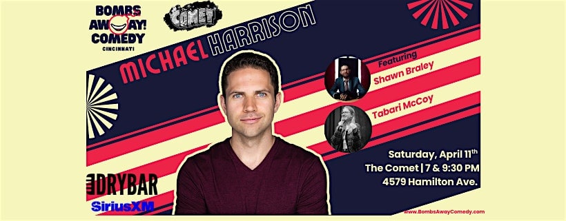 by admin14Feb Comedy At The Comet | MICHAEL HARRISON at Bombs Away! Comedy at the Comet – Cincinnati, OH Comedy At The Comet | MICHAEL HARRISON at Bombs Away! Comedy at the Comet – Cincinnati, OH 1 1 people viewed this event. Comedian Michael Harrison Performs Live at Comedy @ the Comet on Saturday, April 11th @ 7 & 9:30 PM Tickets-RSVP Link Date And Time Saturday, April 11th, 2026 11:00 PM (PST) Venue Bombs Away! Comedy at the Comet Location 4579 Hamilton Avenue, Cincinnati, OH 45223 Event Types Concert or PerformancePerforming & Visual Arts Event Category CincinnatiOhio Share With Friends Facebook Twitter Linkedin Xing Pinterest Share This Post: