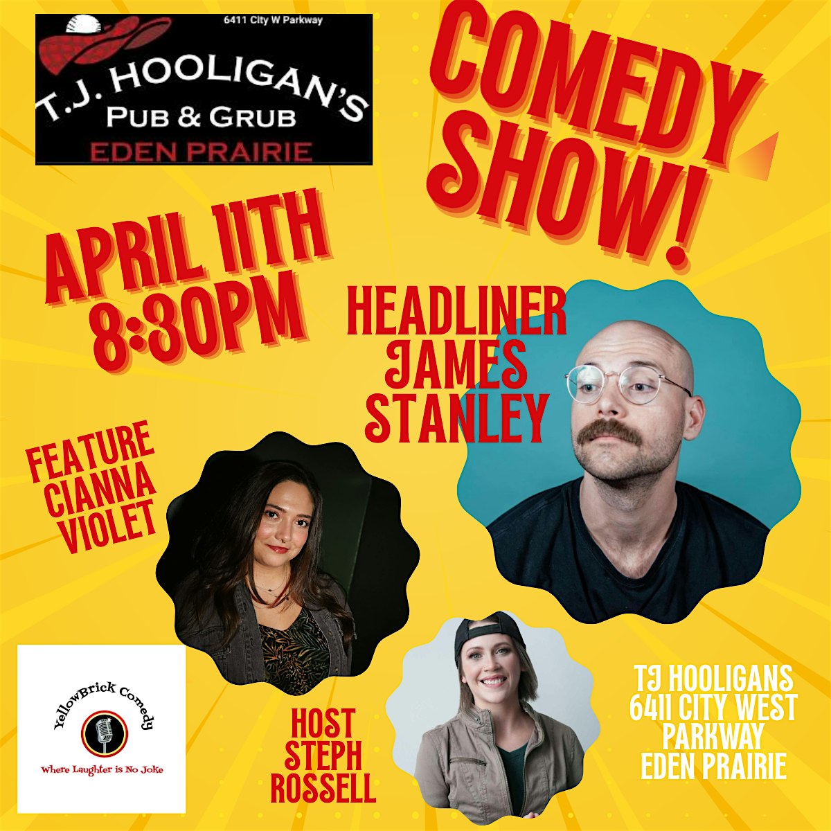 Get ready for a night of top-tier stand-up comedy as Yellow Brick Comedy and TJ Hooligans bring one of the Twin Cities best to the stage. Headlining the evening is James Stanley!