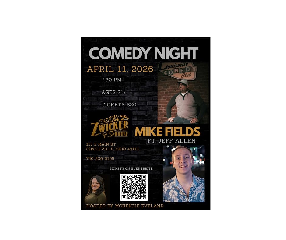 by admin14Feb Comedy Night at Zwicker House at 115 E Main St – Circleville, OH Comedy Night at Zwicker House at 115 E Main St – Circleville, OH 1 1 people viewed this event. Get ready for another night of laughs and good vibes at Zwicker House! Join us for a special Comedy Night hosted by McKenzie Eveland. Tickets-RSVP Link Date And Time Saturday, April 11th, 2026 11:00 PM (PST) Venue 115 E Main St Location 115 East Main Street, Circleville, OH 43113 Event Types Concert or PerformancePerforming & Visual Arts Event Category Ohio Share With Friends Facebook Twitter Linkedin Xing Pinterest Share This Post: