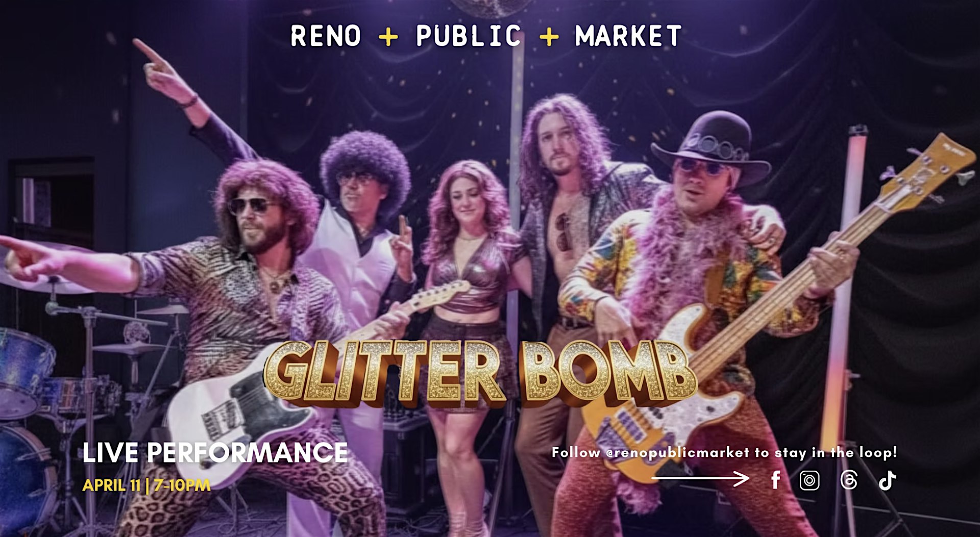 by admin24Feb Glitter Bomb LIVE at Reno Public Market at Reno Public Market – Reno, NV Glitter Bomb LIVE at Reno Public Market at Reno Public Market – Reno, NV 1 1 people viewed this event. See you there! Tickets-RSVP Link Date And Time Saturday, April 11th, 2026 07:00 PM (PST) Venue Reno Public Market Location 299 East Plumb Lane, Reno, NV 89502 Event Types Concert or PerformanceMusic Event Category NevadaReno Share With Friends Facebook Twitter Linkedin Xing Pinterest Share This Post: