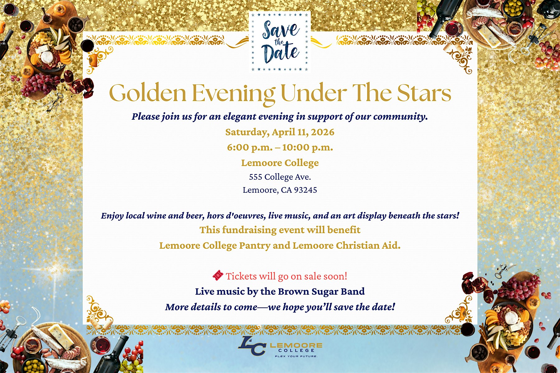 by admin27Feb Golden Evening Under The Stars Sponsorship at West Hills College Lemoore – Lemoore, CA Golden Evening Under The Stars Sponsorship at West Hills College Lemoore – Lemoore, CA 2 2 people viewed this event. Enjoy local wine and beer, hors d’oeuvres, live music, and an art display beneath the stars at Lemoore College. Tickets-RSVP Link Date And Time Saturday, April 11th, 2026 @ 06:00 PM Location 555 College Avenue, Lemoore, CA 93245 Event Types Charity & CausesParty or Social Gathering Event Category California Share With Friends Facebook Twitter Linkedin Xing Pinterest Share This Post: