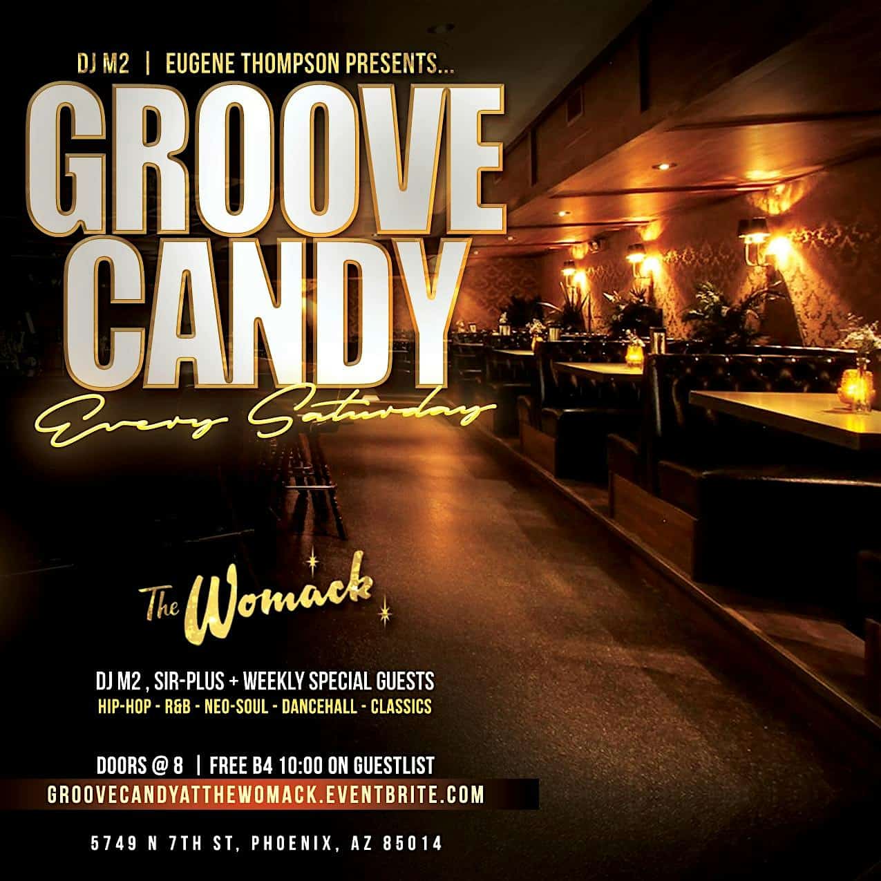 by admin23Feb GROOVE CANDY at The Womack – Phoenix, AZ GROOVE CANDY at The Womack – Phoenix, AZ 2 2 people viewed this event. Groove Candy Hip-Hop – R&B – Neo Soul – Dancehall – Classics Tickets-RSVP Link Date And Time Saturday, April 11th, 2026 08:00 PM (PST) Venue The Womack Location 5749 North 7th Street, Phoenix, AZ 85014 Event Types MusicParty or Social Gathering Event Category ArizonaPhoenix Share With Friends Facebook Twitter Linkedin Xing Pinterest Share This Post: