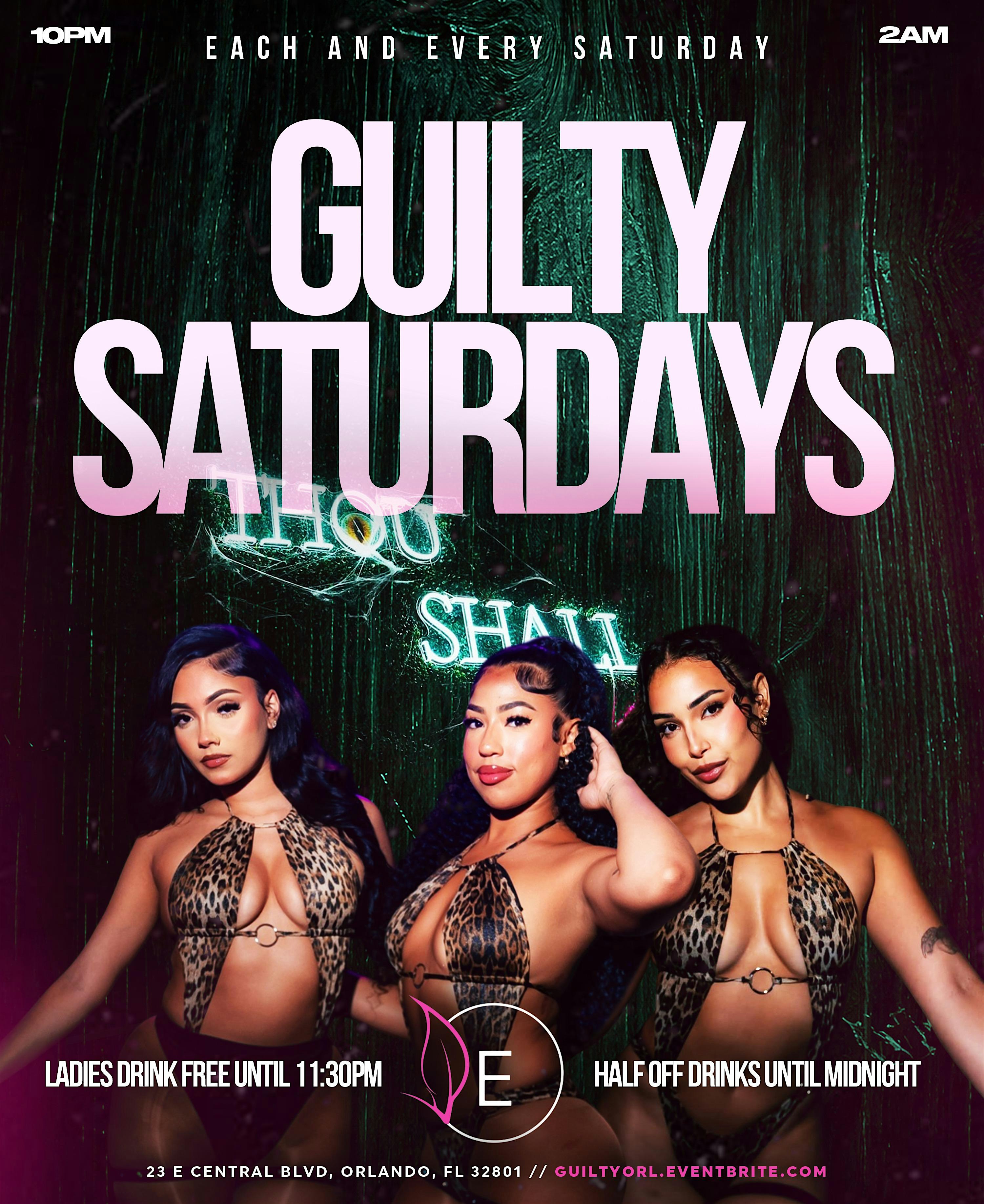 Guilty Saturdays at Eden The Lounge – Orlando, FL Guilty Saturdays at Eden The Lounge – Orlando, FL 2 2 people viewed this event. The hottest Saturday Night Party In Dowtown Orlando Each & every Saturday night meet us downtown at @edenthelounge (10pm-2am) ???????? Powered by: @block_spinna | @jrandrews8 | @steveo__tv | @TomTomTCV Tickets-RSVP Link Register for event Date And Time Saturday, April 11th, 2026 @ 10:00 PM Location 23 East Central Boulevard, Orlando, FL 32801 Event Types MusicParty or Social Gathering Event Category FloridaOrlando Share With Friends Facebook Twitter Linkedin Xing Pinterest