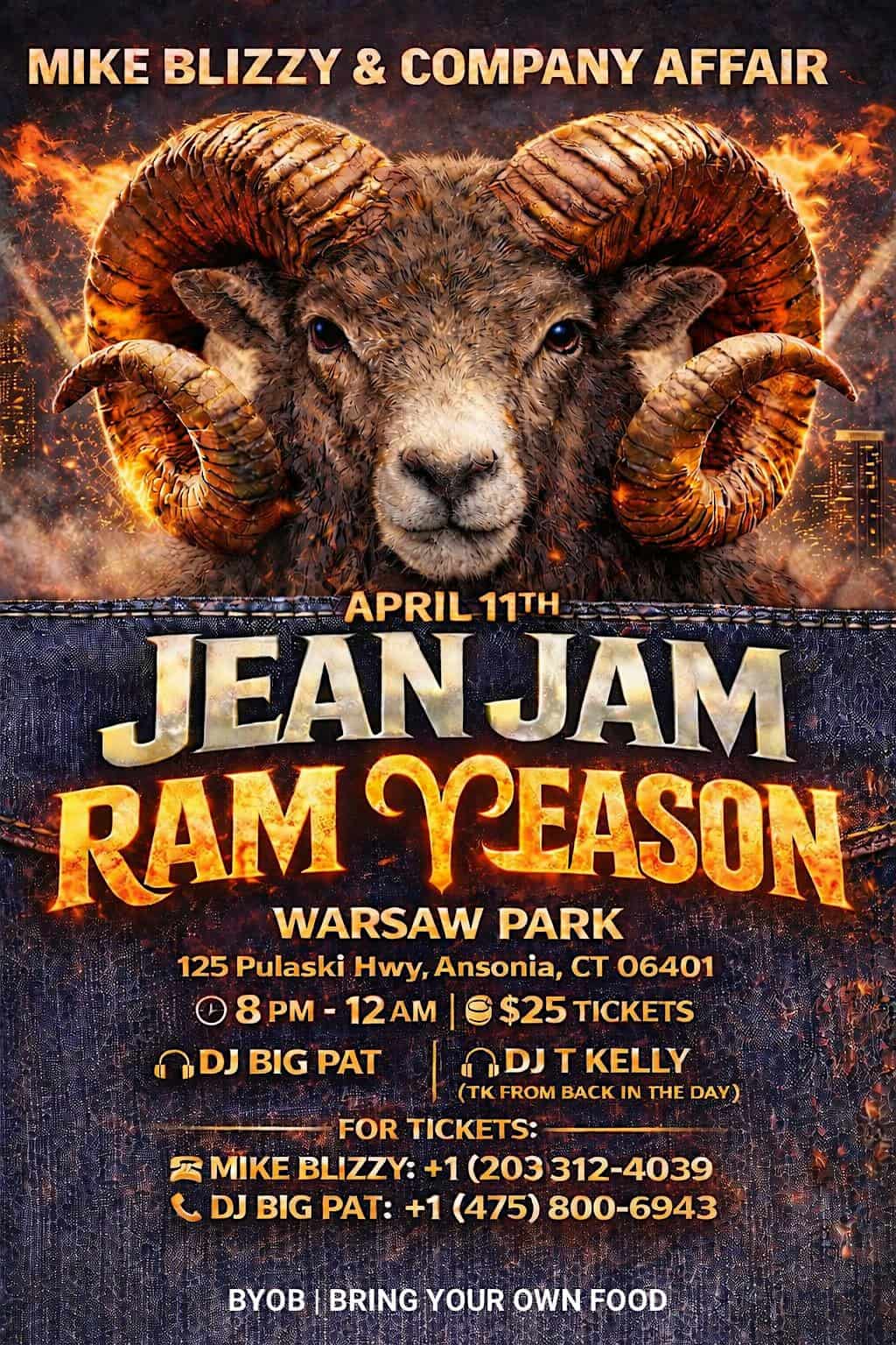 by admin23Feb Jean Jam: – Hosted by Mike Blizzy & Company at Warsaw Park – Ansonia, CT Jean Jam: – Hosted by Mike Blizzy & Company at Warsaw Park – Ansonia, CT 3 3 people viewed this event. JEAN JAM: RAM SEASON Hosted by Mike Blizzy & Company Pull up in your best denim, come and celebrate your birthday with us, 8-1:00am Tickets-RSVP Link Date And Time Saturday, April 11th, 2026 08:00 PM (PST) Venue Warsaw Park Location 119 Pulaski Highway, Ansonia, CT 6401 Event Types MusicParty or Social Gathering Event Category BridgeportConnecticut Share With Friends Facebook Twitter Linkedin Xing Pinterest Share This Post: