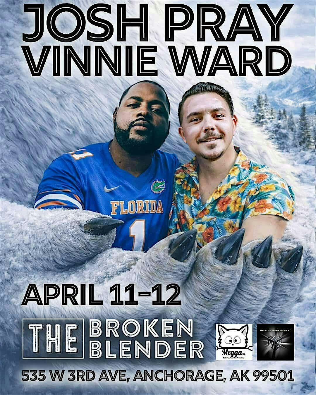 JOSH PRAY AND VINNIE WARD LIVE AT THE BROKEN BLENDER at The Broken Blender – Anchorage, AK JOSH PRAY AND VINNIE WARD LIVE AT THE BROKEN BLENDER at The Broken Blender – Anchorage, AK 1 1 people viewed this event. Get ready to laugh until you cry as Josh Pray and Vinnie Ward take the stage live at The Broken Blender! Fri Night Shows Vinnie is Headliner Tickets-RSVP Link Register for event Date And Time Saturday, April 11th, 2026 @ 07:00 PM Location 535 West 3rd Avenue, Anchorage, AK 99501 Event Types Concert or PerformancePerforming & Visual Arts Event Category AlaskaAnchorage Share With Friends Facebook Twitter Linkedin Xing Pinterest