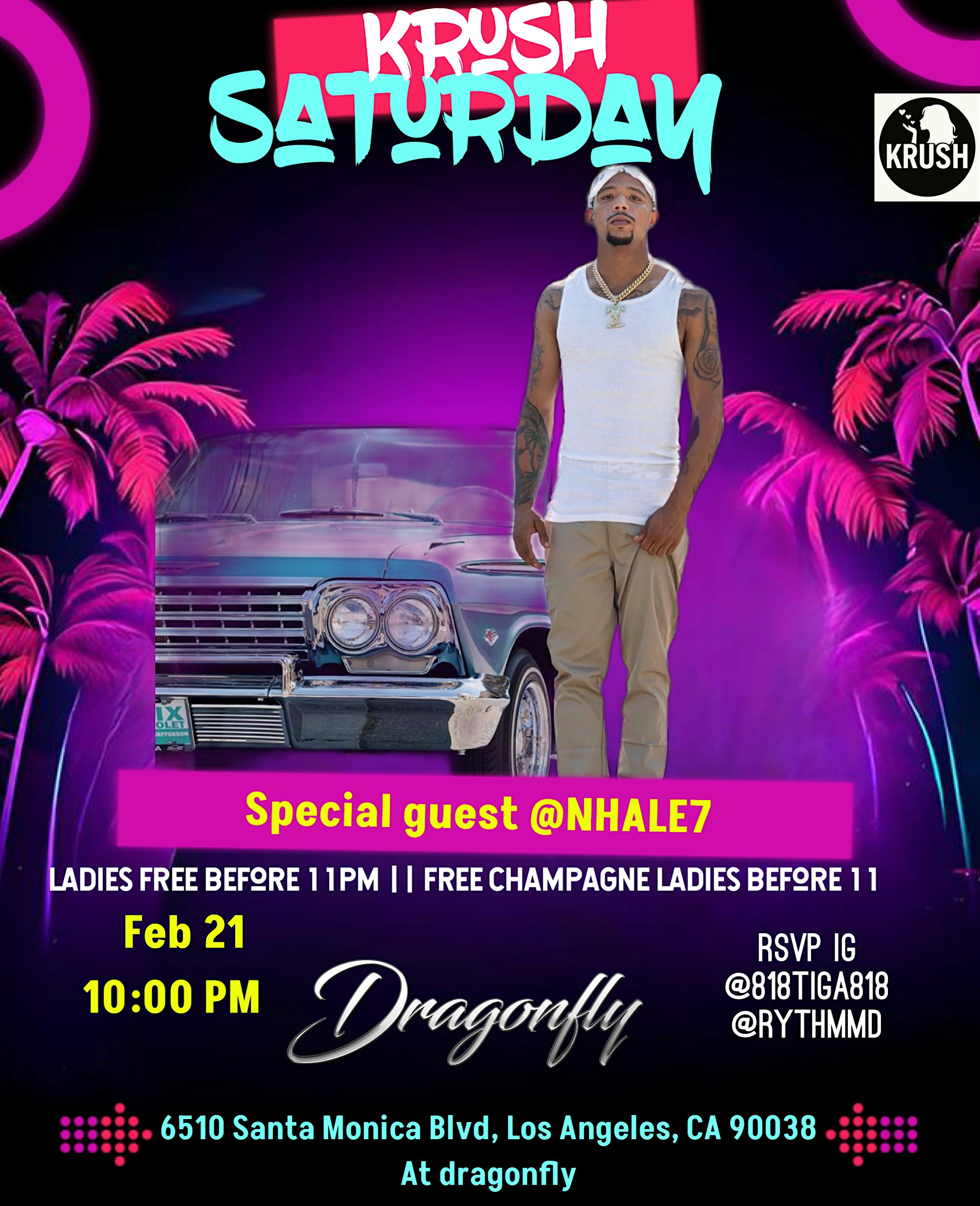 by admin24Feb KRUSH Saturday at 6510 Santa Monica Blvd – Los Angeles, CA KRUSH Saturday at 6510 Santa Monica Blvd – Los Angeles, CA 2 2 people viewed this event. Get ready to kick off your weekend with some serious fun, music and dancing at KRUSH Saturday – it’s going to be lit! @The Dragonfly!!! Tickets-RSVP Link Date And Time Saturday, April 11th, 2026 10:00 PM (PST) Venue 6510 Santa Monica Blvd Location 6510 Santa Monica Boulevard, Los Angeles, CA 90038 Event Types MusicParty or Social Gathering Event Category CaliforniaLos Angeles Share With Friends Facebook Twitter Linkedin Xing Pinterest Share This Post: