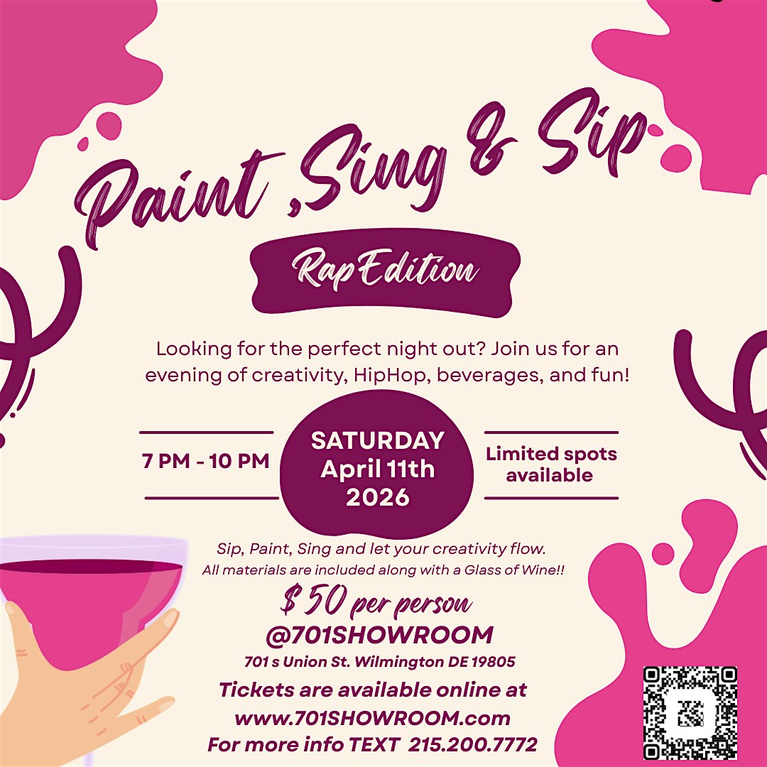 by admin27Feb Paint Sing & Sip Rap Edition at 701 S Union St – Wilmington, DE Paint Sing & Sip Rap Edition at 701 S Union St – Wilmington, DE 2 2 people viewed this event. Chill night of painting, rapping, singing, and sipping—come vibe and create some art with us! Tickets-RSVP Link Date And Time Saturday, April 11th, 2026 @ 07:00 PM Location 701 South Union Street, Wilmington, DE 19805 Event Types Party or Social GatheringPerforming & Visual Arts Event Category Delaware Share With Friends Facebook Twitter Linkedin Xing Pinterest Share This Post: