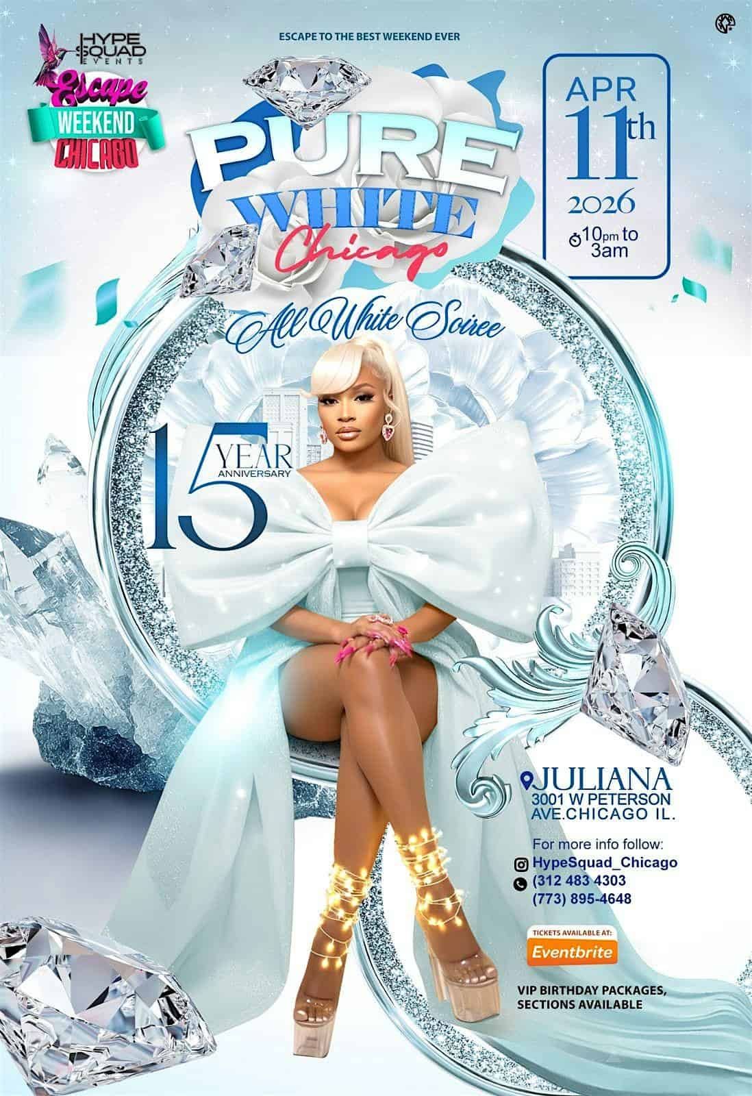 by admin23Feb PURE WHITE All-White soirée at Juliana Restaurant – Chicago, IL PURE WHITE All-White soirée at Juliana Restaurant – Chicago, IL 2 2 people viewed this event. The city’s most anticipated All-White soirée experience Tickets-RSVP Link Date And Time Saturday, April 11th, 2026 @ 10:00 PM Location 3001 West Peterson Avenue, Chicago, IL 60659 Event Types Fashion & BeautyParty or Social Gathering Event Category ChicagoIllinois Share With Friends Facebook Twitter Linkedin Xing Pinterest Share This Post: