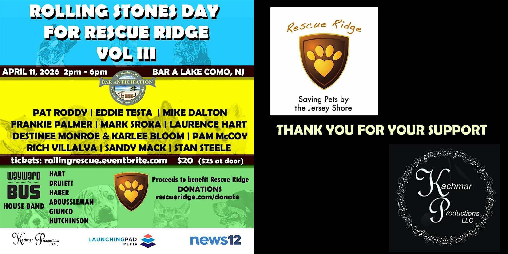 by admin14Feb Rolling Stones For Rescue Ridge 3rd Annual at Bar Anticipation – Lake Como, NJ Rolling Stones For Rescue Ridge 3rd Annual at Bar Anticipation – Lake Como, NJ 1 1 people viewed this event. Join us for a great afternoon all to benefit Rescue Ridge ! See your favorite musicians performing hits from the Rolling Stones Tickets-RSVP Link Date And Time Saturday, April 11th, 2026 05:00 PM (PST) Venue Bar Anticipation Location 703 16th Avenue, Lake Como, NJ 7719 Event Types Charity & CausesConcert or Performance Event Category Asbury ParkNew Jersey Share With Friends Facebook Twitter Linkedin Xing Pinterest Share This Post: