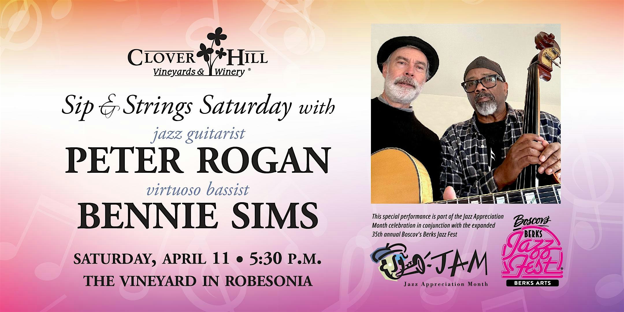 by admin13Feb Sip & Strings Saturday with Peter Rogan and Bennie Sims at Clover Hill Vineyards & Winery – Robesonia, PA Sip & Strings Saturday with Peter Rogan and Bennie Sims at Clover Hill Vineyards & Winery – Robesonia, PA 1 1 people viewed this event. Clover Hill Vineyards & Winery is thrilled to welcome jazz guitarist Peter Rogan and virtuoso bassist Bennie Sims to Robesonia. Tickets-RSVP Link Date And Time Saturday, April 11th, 2026 09:00 PM (PST) Venue Clover Hill Vineyards & Winery Location 17 Clover Hill Ln, Robesonia, PA 19551 Event Types Concert or PerformanceMusic Event Category Pennsylvania Share With Friends Facebook Twitter Linkedin Xing Pinterest Share This Post: