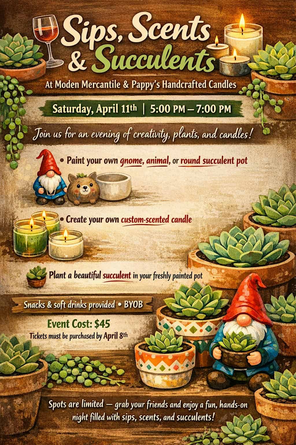 by admin23Feb Sips, Scents & Succulents at Moden Mercantile – New Brighton, PA Sips, Scents & Succulents at Moden Mercantile – New Brighton, PA 2 2 people viewed this event. Paint a plant pot, create a custom candle and plant a succulent in your new pot all while sipping a delicious beverage! Tickets-RSVP Link Date And Time Saturday, April 11th, 2026 05:00 PM (PST) Venue Moden Mercantile Location 303 8th Street, New Brighton, PA 15066 Event Types Party or Social Gathering Event Category Pennsylvania Share With Friends Facebook Twitter Linkedin Xing Pinterest Share This Post: