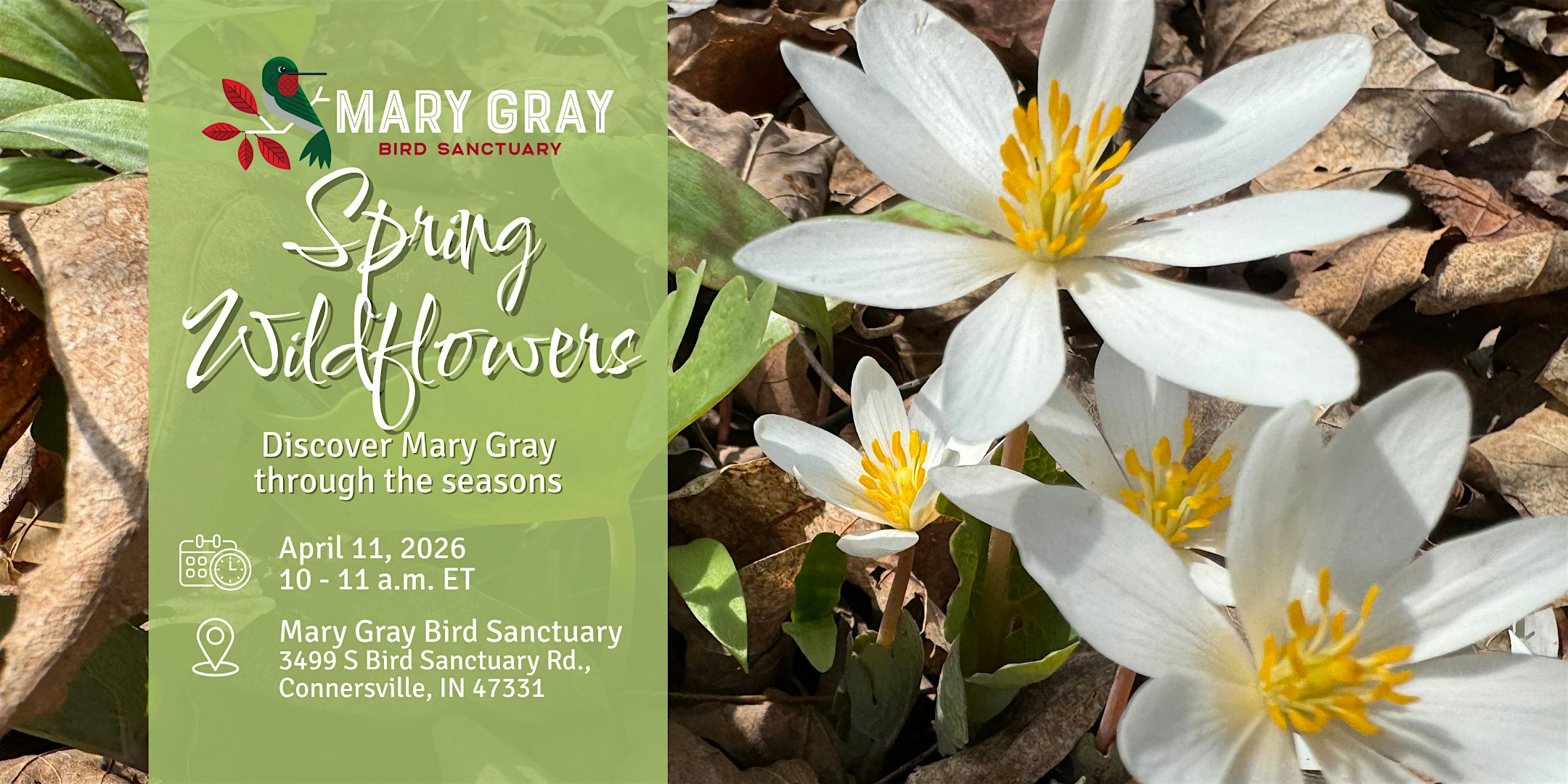 Join us on April 11 for a guided hike at Mary Gray Bird Sanctuary as we search for and identify early spring wildflowers in bloom. Debbie Bruce, local naturalist and spring ephemeral guru, will guide us in search of these forest floor gems. As the forest awakens, well look for trillium, spring beauties, bloodroot, and other seasonal gems while learning tips for plant identification and the natural history of these ephemeral blooms. This walk is perfect for nature lovers of all experience levelsbring your curiosity!