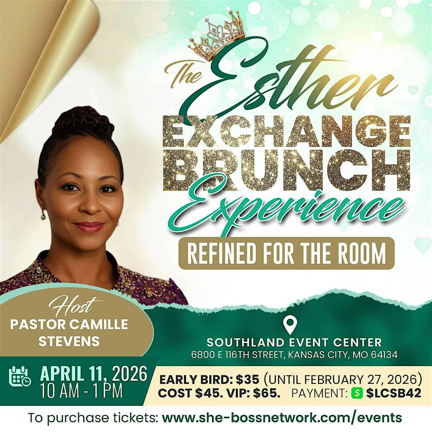 by admin23Feb The Esther Exchange Brunch Experience at Southland Event Center – Kansas City, MO The Esther Exchange Brunch Experience at Southland Event Center – Kansas City, MO 2 2 people viewed this event. The Esther Exchange Brunch is an elevated, interactive leadership brunch for women who know they are in a defining season. Tickets-RSVP Link Date And Time Saturday, April 11th, 2026 10:00 AM (PST) Venue Southland Event Center Location 6800 East 116th Street, Kansas City, MO 64134 Event Types Party or Social Gathering Event Category Kansas CityMissouri Share With Friends Facebook Twitter Linkedin Xing Pinterest Share This Post: