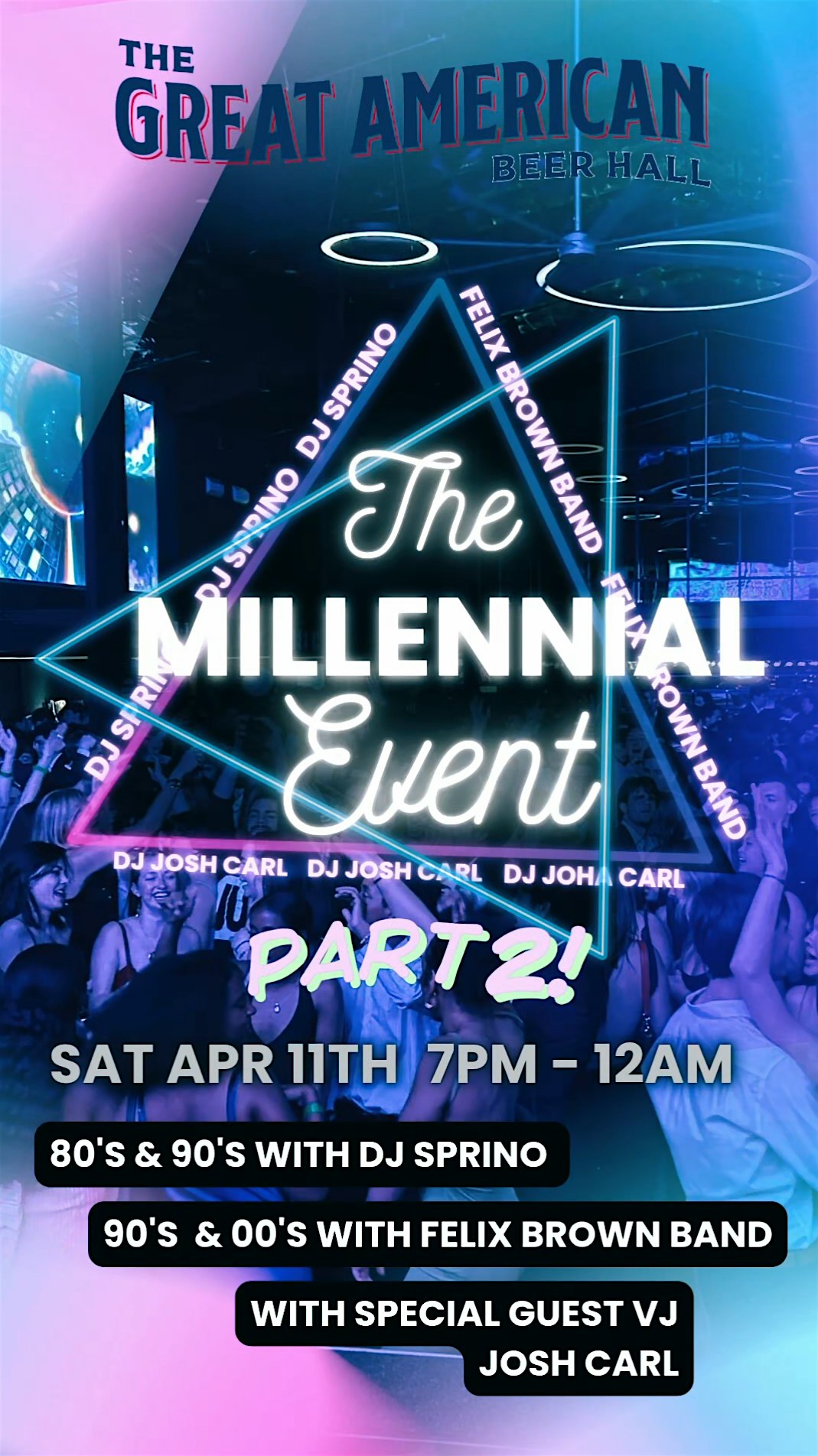 by admin13Feb The Millennial Event Pt 2 at The Great American Beer Hall – Medford, MA The Millennial Event Pt 2 at The Great American Beer Hall – Medford, MA 1 1 people viewed this event. The Millennial Event Pt 2! We’re bringing you back in time with another Amazing Y2K themed night. Throwback fits encouraged. Tickets-RSVP Link Date And Time Saturday, April 11th, 2026 11:00 PM (PST) Venue The Great American Beer Hall Location 142 Mystic Avenue, Medford, MA 2155 Event Types Food & DrinkParty or Social Gathering Event Category Massachusetts Share With Friends Facebook Twitter Linkedin Xing Pinterest Share This Post:
