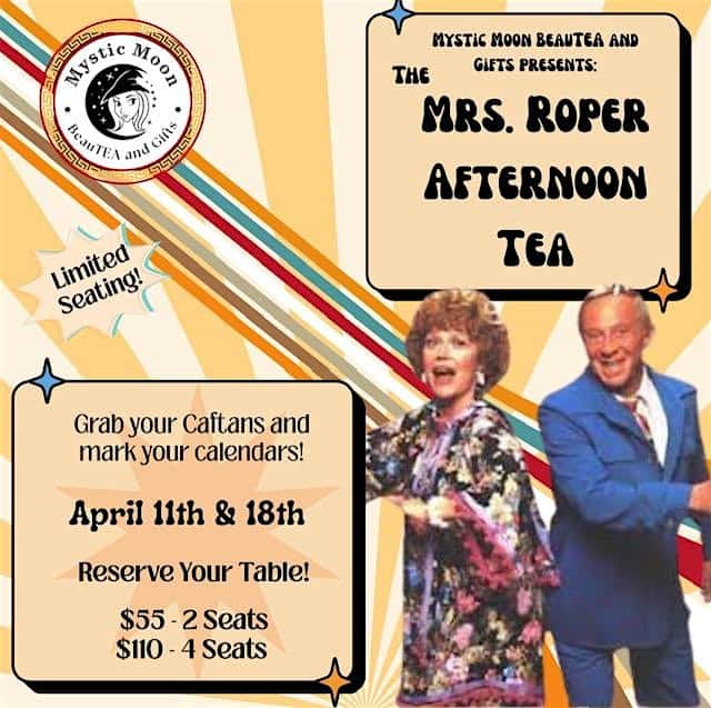 by admin23Feb The Mrs. Roper Afternoon Tea Service at Mystic Moon BeauTEA and Gifts – Delaware, OH The Mrs. Roper Afternoon Tea Service at Mystic Moon BeauTEA and Gifts – Delaware, OH 2 2 people viewed this event. Grab your boldest caftan and join us for a fabulous tea service inspired by everyone’s favorite queen of leisure. Tickets-RSVP Link Date And Time Saturday, April 11th, 2026 12:00 PM (PST) Venue Mystic Moon BeauTEA and Gifts Location 30 South Sandusky Street, Delaware, OH 43015 Event Types Food & DrinkParty or Social Gathering Event Category Ohio Share With Friends Facebook Twitter Linkedin Xing Pinterest Share This Post: