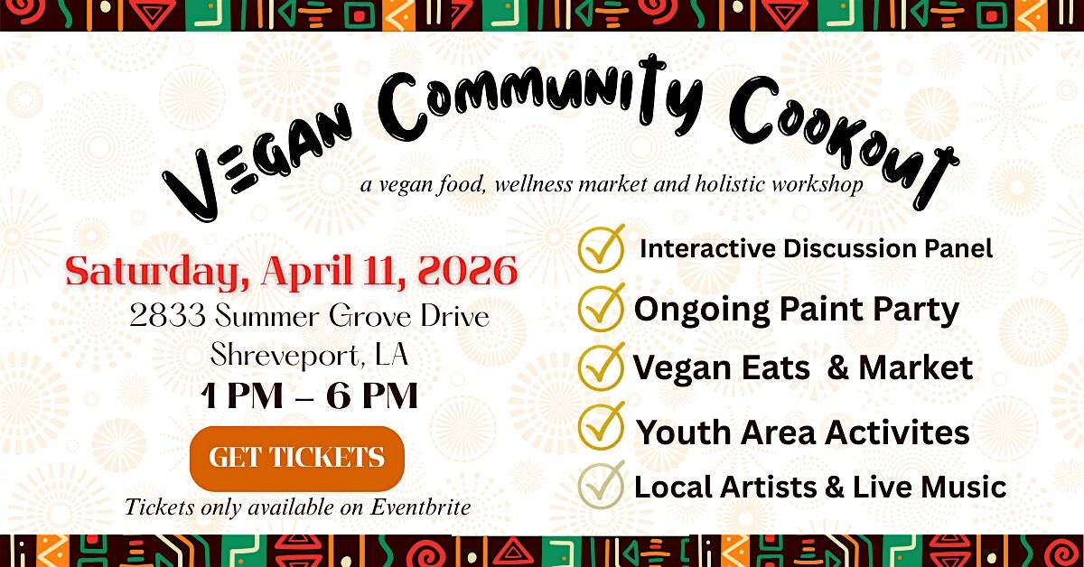 by admin14Feb Vegan Community Cookout at JADE Events Venue – Shreveport, LA Vegan Community Cookout at JADE Events Venue – Shreveport, LA 1 1 people viewed this event. Shreveport’s plant-based wellness festival and family-friendly celebration of food, culture, and community healing Tickets-RSVP Link Date And Time Saturday, April 11th, 2026 06:00 PM (PST) Venue JADE Events Venue Location 2833 Summer Grove Drive, Shreveport, LA 71118 Event Types Festival or FairFood & Drink Event Category LouisianaShreveport Share With Friends Facebook Twitter Linkedin Xing Pinterest Share This Post: