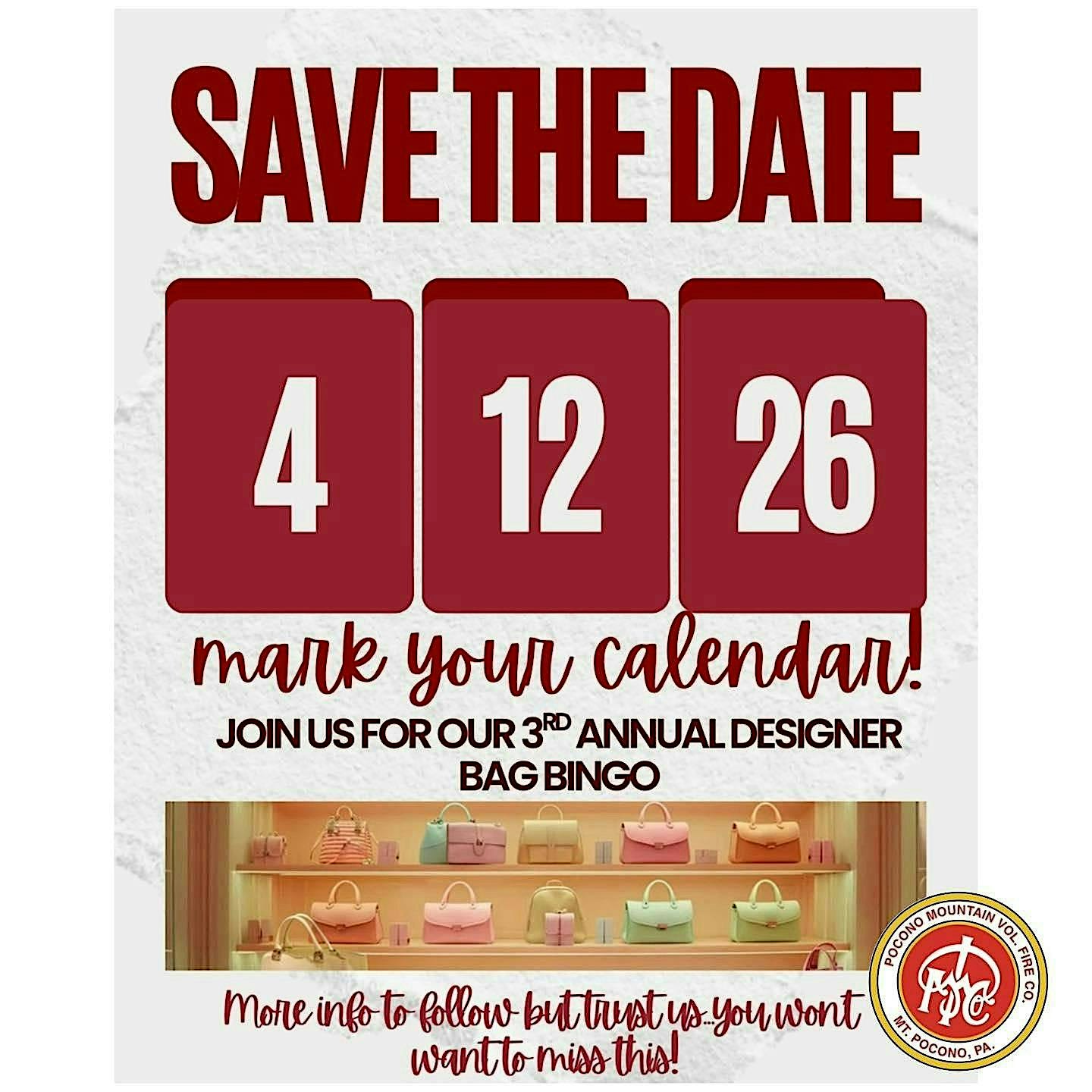 by admin13Feb 3rd Annual Designer Handbag Bingo at 20 Murray St – Mount Pocono, PA 3rd Annual Designer Handbag Bingo at 20 Murray St – Mount Pocono, PA 1 1 people viewed this event. Designer Handbag Bingo supporting the Pocono Mountain Volunteer Fire Company Ladies Auxiliary and Pocono Mountain Volunteer Fire Company Tickets-RSVP Link Date And Time Sunday, April 12th, 2026 04:00 PM (PST) Venue 20 Murray St Location 20 Murray Street, Mount Pocono, PA 18344 Event Types Fashion & BeautyParty or Social Gathering Event Category Pennsylvania Share With Friends Facebook Twitter Linkedin Xing Pinterest Share This Post: