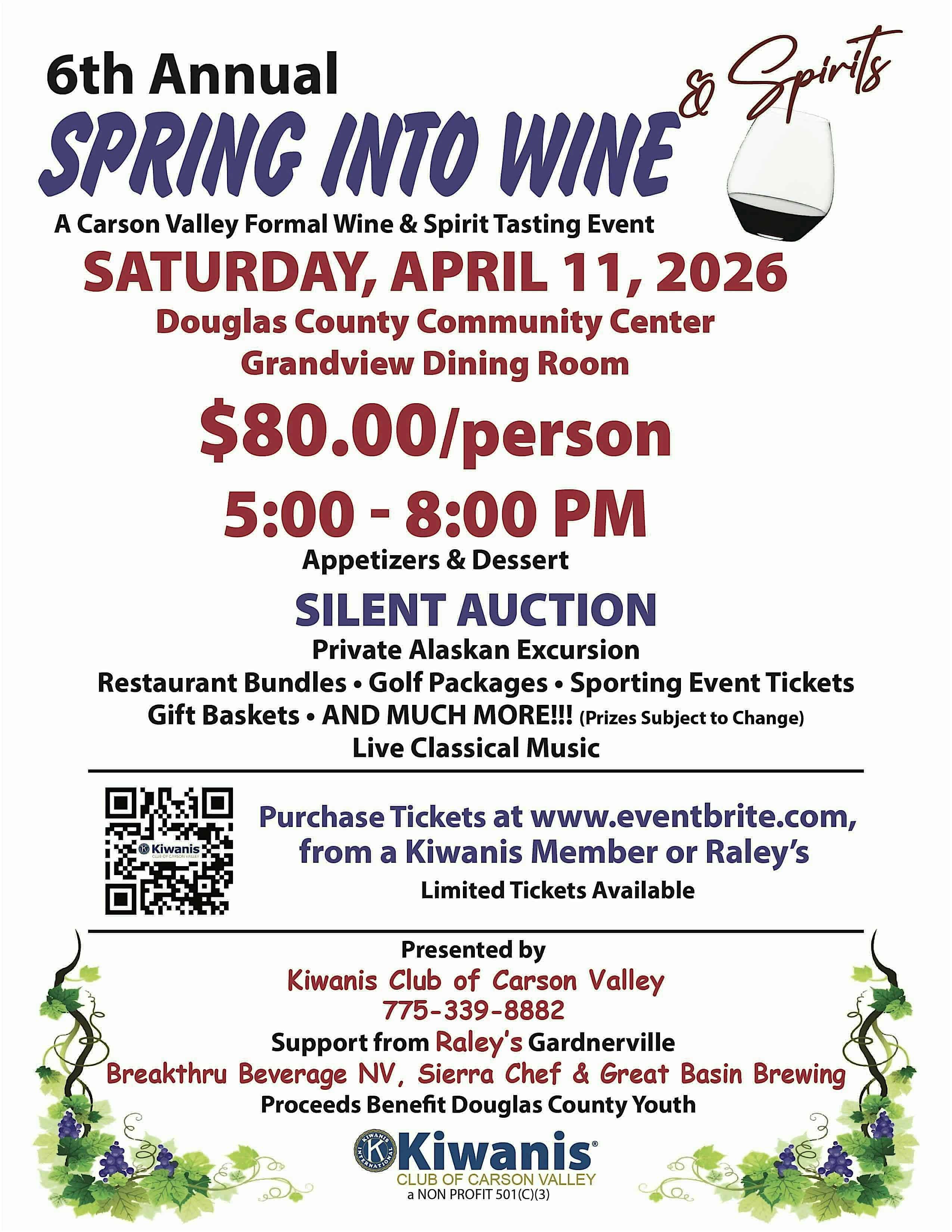 by admin14Feb 6th Annual Spring Into Wine & Spirits – 2026 at Douglas County Community & Senior Center – Gardnerville, NV 6th Annual Spring Into Wine & Spirits – 2026 at Douglas County Community & Senior Center – Gardnerville, NV 1 1 people viewed this event. Wine & spirits tasting event hosted by Kiwanis Club of Carson Valley. Silent auction & raffles. Proceeds benefit Douglas County youth. Tickets-RSVP Link Date And Time Sunday, April 12th, 2026 12:00 AM (PST) Venue Douglas County Community & Senior Center Location 1329 Waterloo Lane, Gardnerville, NV 89410 Event Types Food & DrinkOther Event Category Nevada Share With Friends Facebook Twitter Linkedin Xing Pinterest Share This Post: