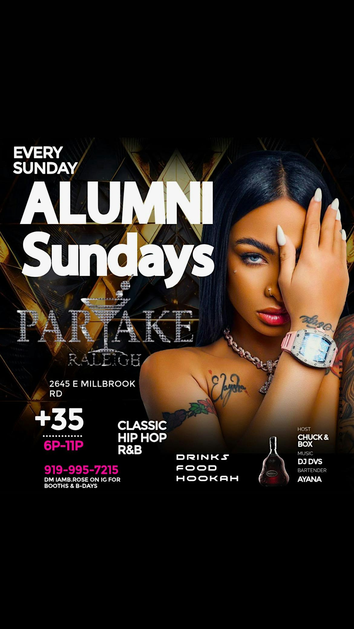 ALUMNI SUNDAYS ULTIMATE 35+ DAY/NIGHT AFFAIR at PARTAKE RALEIGH – RALEIGH, NC ALUMNI SUNDAYS ULTIMATE 35+ DAY/NIGHT AFFAIR at PARTAKE RALEIGH – RALEIGH, NC 3 3 people viewed this event. GROWN MATURE AFFAIR-300FT TVS FOR GAMES-FOOD-HOOKAH-OUTDOOR PATIO-NO COVER CHARGE-ALUMNI WKND MUSIC & VIBES Tickets-RSVP Link Register for event Date And Time Sunday, April 12th, 2026 @ 06:00 PM Location 2645 E.MILLBROOK RD, RALEIGH, NC 27604 Event Types Food & DrinkParty or Social Gathering Event Category North CarolinaRaleigh Share With Friends Facebook Twitter Linkedin Xing Pinterest