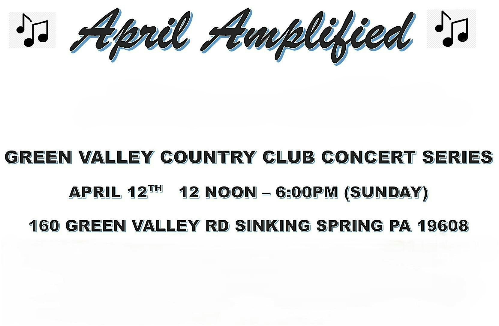 by admin24Feb APRIL AMPLIFIED at Green Valley Country Club – Sinking Spring, PA APRIL AMPLIFIED at Green Valley Country Club – Sinking Spring, PA 2 2 people viewed this event. “APRIL AMPLIFIED” IS THE START OF THE “GREEN VALLEY CONCERT SERIES” LOCATED AT GREEN VALLEY COUNTRY CLUB. Tickets-RSVP Link Date And Time Sunday, April 12th, 2026 12:00 PM (PST) Venue Green Valley Country Club Location 160 Green Valley Road, Sinking Spring, PA 19608 Event Types Concert or PerformanceMusic Event Category Pennsylvania Share With Friends Facebook Twitter Linkedin Xing Pinterest Share This Post: