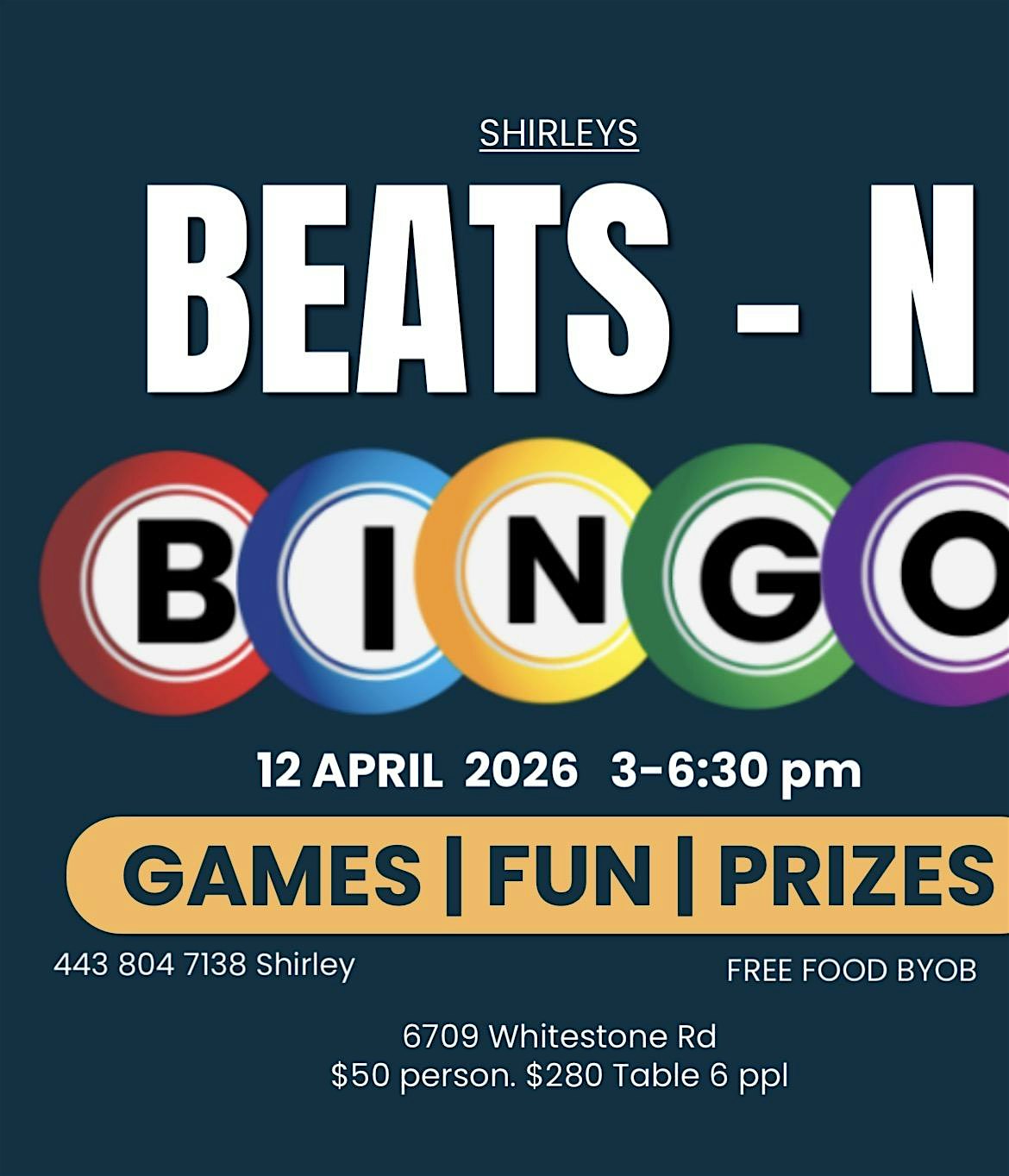 by admin13Feb BEATS N BINGO at 6709 Whitestone Road, Woodlawn, MD, USA – Woodlawn, MD BEATS N BINGO at 6709 Whitestone Road, Woodlawn, MD, USA – Woodlawn, MD 1 1 people viewed this event. Beats and bingo, free food BYOB Tickets-RSVP Link Date And Time Sunday, April 12th, 2026 07:00 PM (PST) Venue 6709 Whitestone Road, Woodlawn, MD, USA Location 6709 Whitestone Road, Woodlawn, MD 21207 Event Types MusicParty or Social Gathering Event Category BaltimoreMaryland Share With Friends Facebook Twitter Linkedin Xing Pinterest Share This Post: