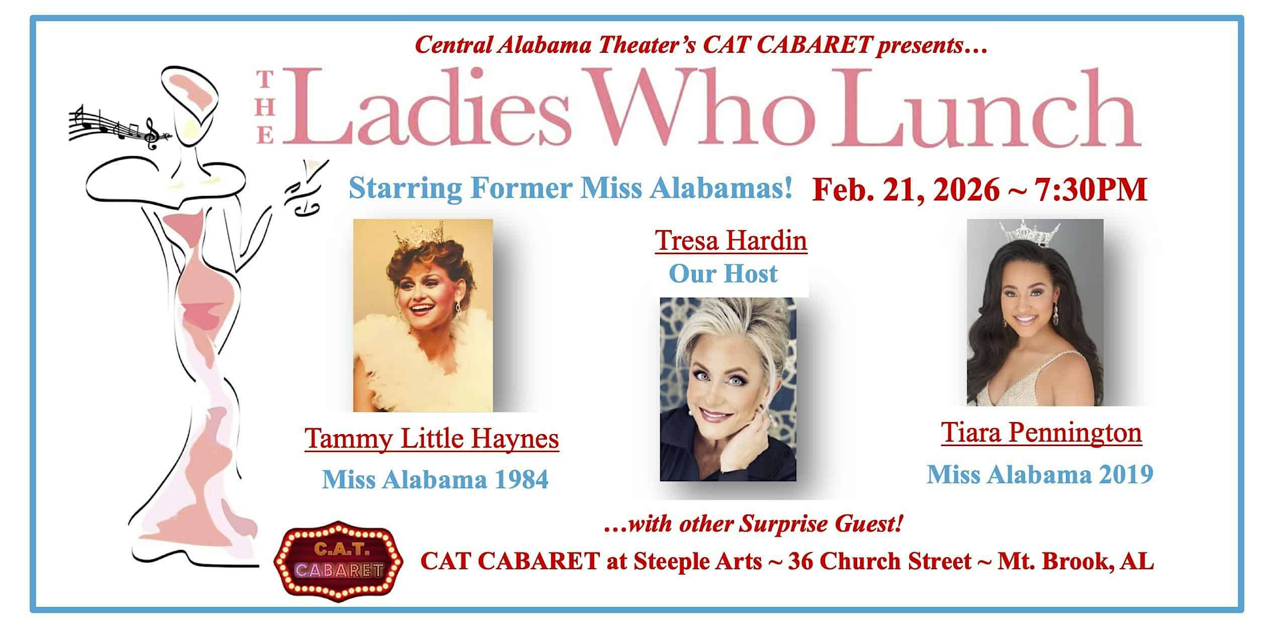 by admin14Feb CAT CABARET – THE LADIES WHO LUNCH!… MOVED TO APRIL! at CENTRAL ALABAMA THEATER at Steeple Arts Academy – Mountain Brook, AL CAT CABARET – THE LADIES WHO LUNCH!… MOVED TO APRIL! at CENTRAL ALABAMA THEATER at Steeple Arts Academy – Mountain Brook, AL 1 1 people viewed this event. Don’t miss this very special CAT Cabaret THE LADIES WHO LUNCH on April 11th at 7:30PM! Tickets-RSVP Link Date And Time Sunday, April 12th, 2026 12:00 AM (PST) Venue CENTRAL ALABAMA THEATER at Steeple Arts Academy Location 36 Church Street, Mountain Brook, AL 35213 Event Types Concert or PerformancePerforming & Visual Arts Event Category AlabamaBirmingham Share With Friends Facebook Twitter Linkedin Xing Pinterest Share This Post: