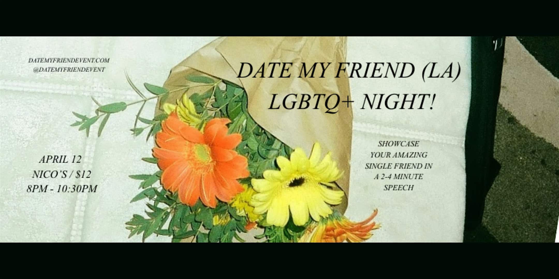 by admin23Feb DATE MY FRIEND! | showcase your single friend! (LGBTQ+ edition) at nico’s – Los Angeles, CA DATE MY FRIEND! | showcase your single friend! (LGBTQ+ edition) at nico’s – Los Angeles, CA 3 3 people viewed this event. Pitch your single friend and see what happens! 90 minutes of pitching with extra time to mingle afterwards. This night is always a hit! Tickets-RSVP Link Date And Time Sunday, April 12th, 2026 08:00 PM (PST) Venue nico's Location 3111 Glendale Boulevard, Los Angeles, CA 90039 Event Types Food & DrinkParty or Social Gathering Event Category CaliforniaLos Angeles Share With Friends Facebook Twitter Linkedin Xing Pinterest Share This Post: