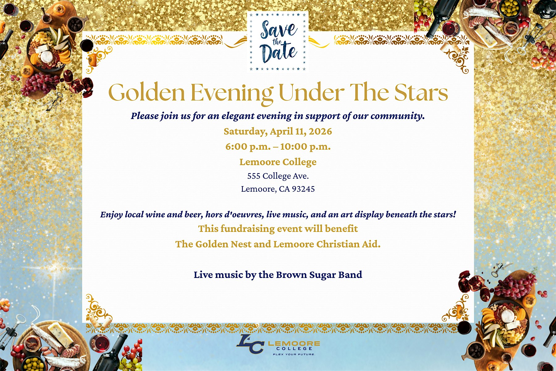 by admin13Feb Golden Evening Under The Stars at West Hills College Lemoore – Lemoore, CA Golden Evening Under The Stars at West Hills College Lemoore – Lemoore, CA 1 1 people viewed this event. Enjoy local wine and beer, hors d’oeuvres, live music, and an art display beneath the stars at Lemoore College. Tickets-RSVP Link Date And Time Sunday, April 12th, 2026 01:00 AM (PST) Venue West Hills College Lemoore Location 555 College Avenue, Lemoore, CA 93245 Event Types Community & CultureParty or Social Gathering Event Category California Share With Friends Facebook Twitter Linkedin Xing Pinterest Share This Post:
