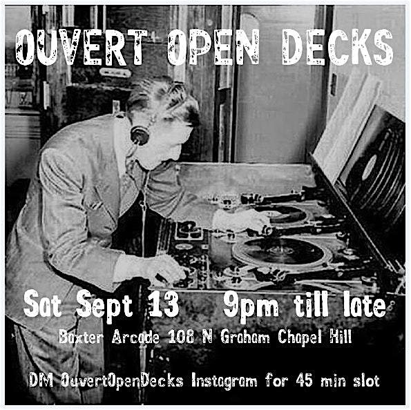 by admin13Feb Ouvert Open Decks at The Baxter Arcade – Carrboro, NC Ouvert Open Decks at The Baxter Arcade – Carrboro, NC 1 1 people viewed this event. DJ open decks 2nd and 4th Saturdays at Baxter Arcade 108 N. Graham St Chapel Hill. DM insta for a 45 minute slot: https://www.instagram.com/ Tickets-RSVP Link Date And Time Sunday, April 12th, 2026 01:00 AM (PST) Venue The Baxter Arcade Location 108 North Graham Street, Carrboro, NC 27510 Event Types Concert or PerformanceMusic Event Category DurhamNorth Carolina Share With Friends Facebook Twitter Linkedin Xing Pinterest Share This Post: