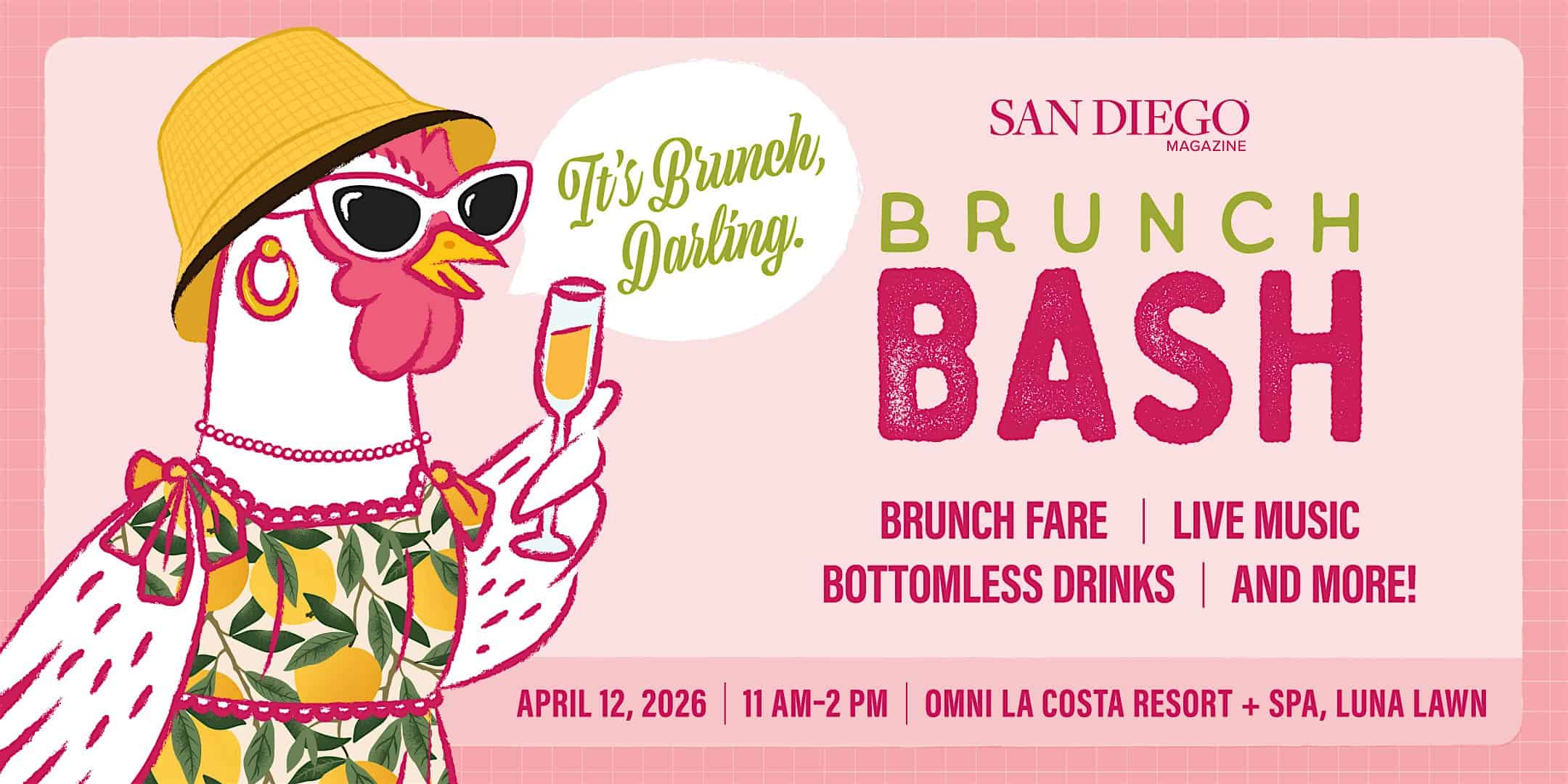 by admin14Feb San Diego Magazine’s 2026 Brunch Bash at Omni La Costa Resort & Spa – Carlsbad, CA San Diego Magazine’s 2026 Brunch Bash at Omni La Costa Resort & Spa – Carlsbad, CA 1 1 people viewed this event. San Diego Magazine’s Brunch Bash is back! Join us for the ultimate Sunday Funday – with delicious bites, sips, and fun! Tickets-RSVP Link Date And Time Sunday, April 12th, 2026 06:00 PM (PST) Venue Omni La Costa Resort & Spa Location 2100 Costa Del Mar Road, Carlsbad, CA 92009 Event Types Festival or FairFood & Drink Event Category California Share With Friends Facebook Twitter Linkedin Xing Pinterest Share This Post: