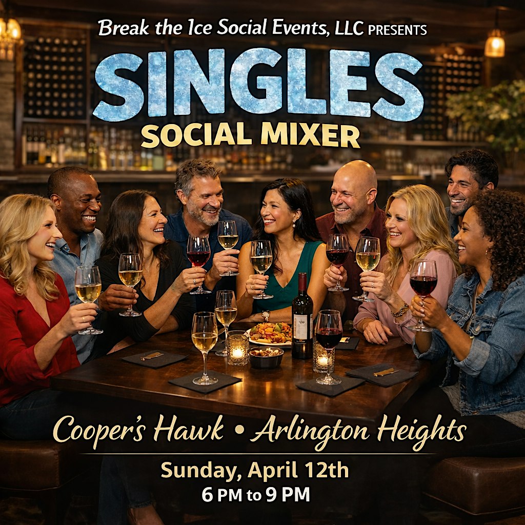 by admin27Feb Singles Social Mixer Arlington Heights Cooper’s Hawk at Cooper’s Hawk Winery & Restaurant – Arlington Heights, IL Singles Social Mixer Arlington Heights Cooper’s Hawk at Cooper’s Hawk Winery & Restaurant – Arlington Heights, IL 3 3 people viewed this event. Get ready to mingle, sip wine, and possibly find your match at the Singles Social Mixer – it’s more than just a party! Tickets-RSVP Link Date And Time Sunday, April 12th, 2026 @ 06:00 PM Location 798 Algonquin Road, Arlington Heights, IL 60005 Event Types Food & DrinkParty or Social Gathering Event Category Illinois Share With Friends Facebook Twitter Linkedin Xing Pinterest Share This Post: