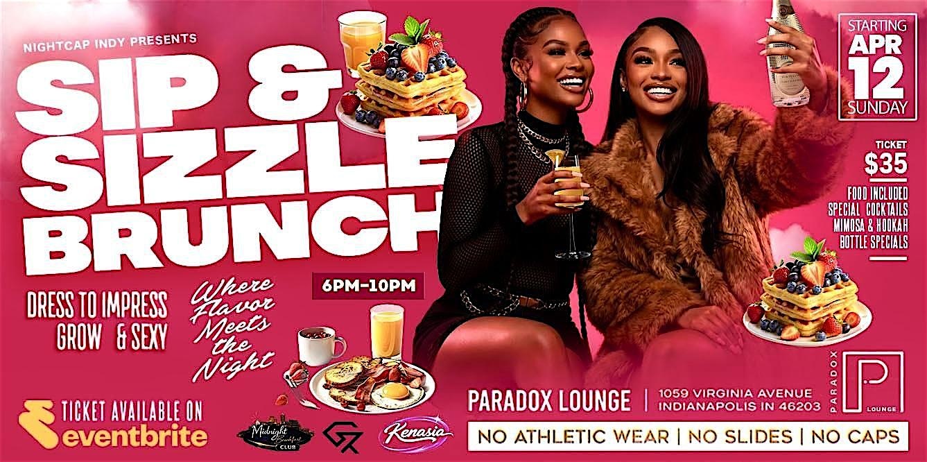 SIP & SIZZLE BRUNCH at Paradox Lounge – Indianapolis, IN SIP & SIZZLE BRUNCH at Paradox Lounge – Indianapolis, IN 2 2 people viewed this event. Kick back with tasty drinks and sizzling bites at a brunch thats all about good vibes and great flavors. Starting March 22nd! Tickets-RSVP Link Register for event Date And Time Sunday, April 12th, 2026 @ 06:00 PM Location 1059 Virginia Avenue, Indianapolis, IN 46203 Event Types Food & DrinkParty or Social Gathering Event Category IndianaIndianapolis Share With Friends Facebook Twitter Linkedin Xing Pinterest