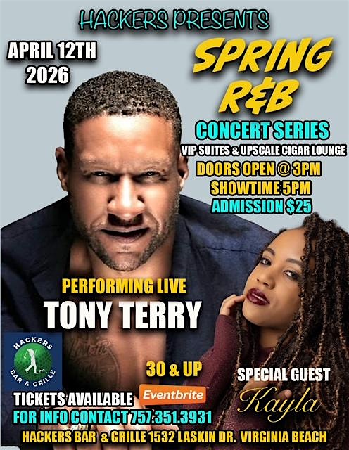 Spring R&B Concert Seried at Hackers Bar & Grille – Virginia Beach, VA Spring R&B Concert Seried at Hackers Bar & Grille – Virginia Beach, VA 3 3 people viewed this event. Tony Terry with special guest Kayla, live at Hackers Bar & Grille in VA Beach.VIP Suites/Upscale Cigar Lounge $25 admission. 30-and-up crowd Tickets-RSVP Link Register for event Date And Time Sunday, April 12th, 2026 @ 05:00 PM Location 1532 Laskin Road, Virginia Beach, VA 23451 Event Types Concert or PerformanceMusic Event Category VirginiaVirginia Beach Share With Friends Facebook Twitter Linkedin Xing Pinterest