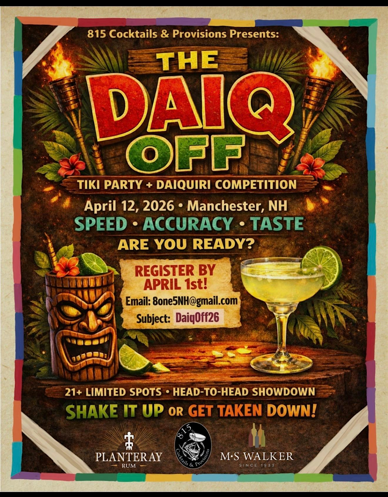 by admin27Feb THE GREAT DAIQ OFF 2026 at 815 Cocktails & Provisions – Manchester, NH THE GREAT DAIQ OFF 2026 at 815 Cocktails & Provisions – Manchester, NH 1 1 people viewed this event. Our 3rd Annual Daiq Off Competition Tickets-RSVP Link Date And Time Sunday, April 12th, 2026 03:00 PM (PST) Venue 815 Cocktails & Provisions Location 815 Elm Street, Manchester, NH 3101 Event Types Food & Drink Event Category New Hampshire Share With Friends Facebook Twitter Linkedin Xing Pinterest Share This Post: