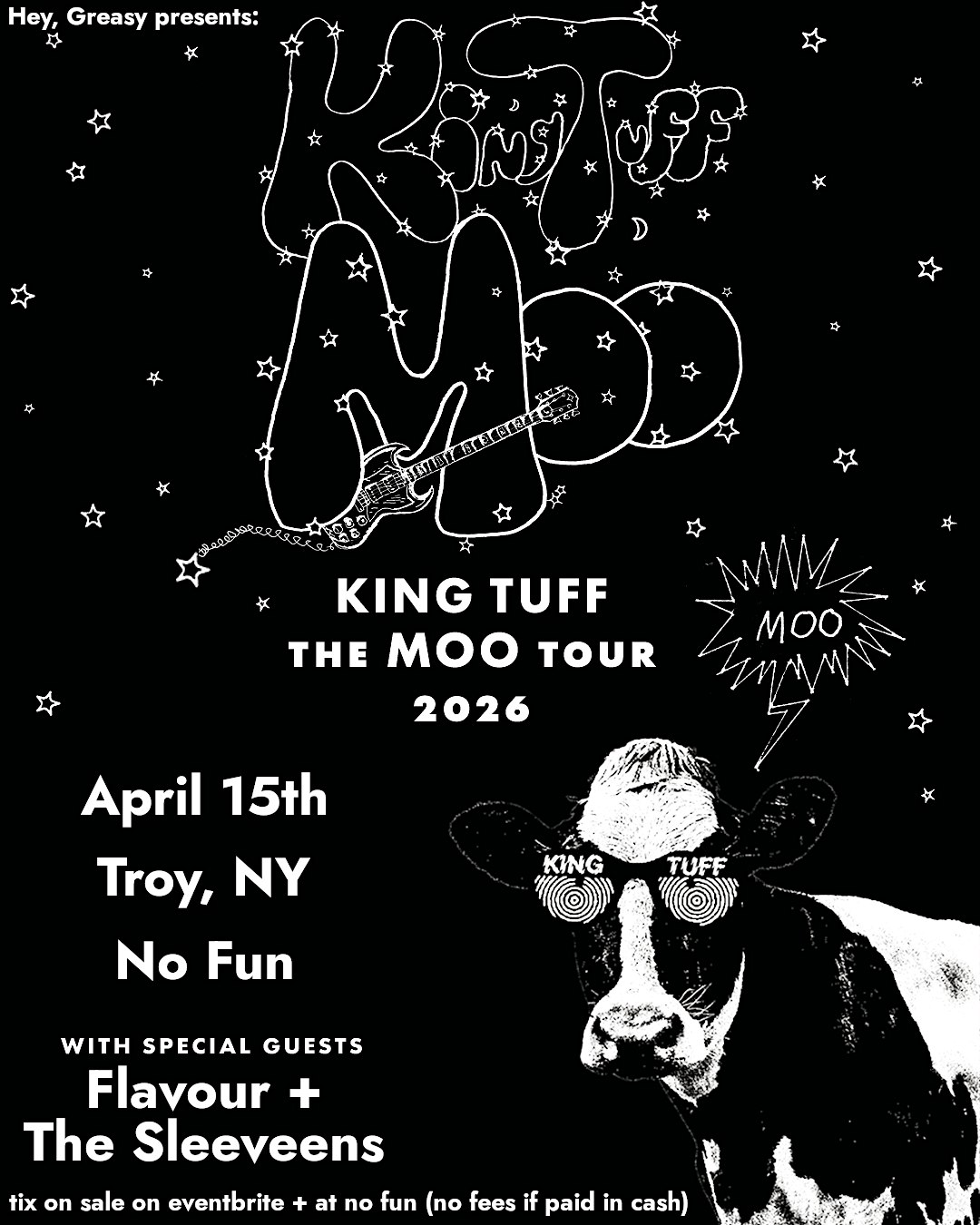 by admin24Feb King Tuff / Flavour / The Sleeveens at NO FUN at No Fun – Troy, NY King Tuff / Flavour / The Sleeveens at NO FUN at No Fun – Troy, NY 2 2 people viewed this event. WED 4/15: King Tuff plays NO FUN in support of their new album MOO! Joined by Flavour (Troy) and The Sleeveens (TN) both w new records! Tickets-RSVP Link Date And Time Wednesday, April 15th, 2026 07:00 PM (PST) Venue No Fun Location 275 River Street, Troy, NY 12180 Event Types Concert or PerformanceMusic Event Category New York Share With Friends Facebook Twitter Linkedin Xing Pinterest Share This Post:
