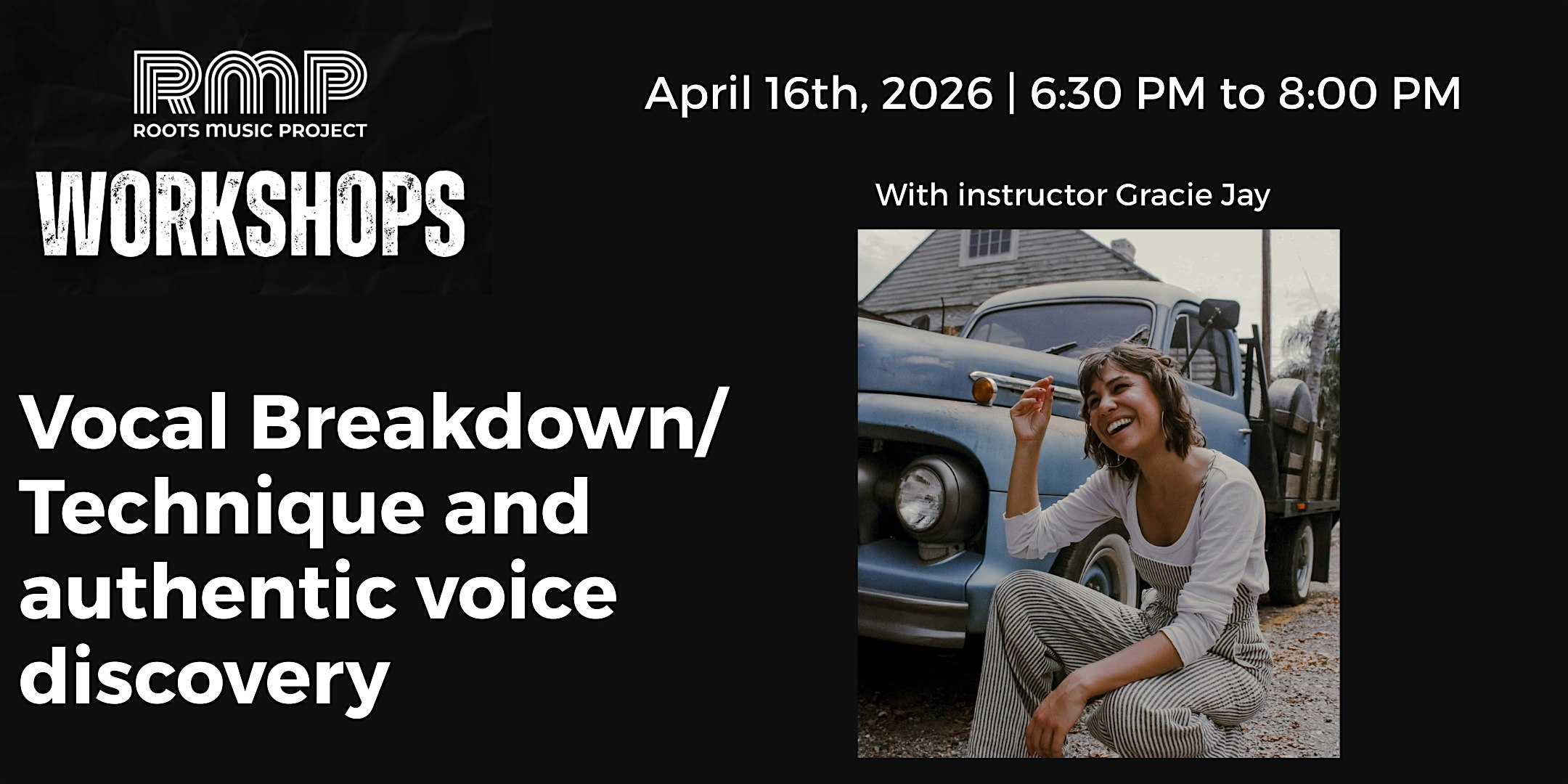by admin13Feb RMP Workshop: Vocal Breakdown/ Technique and authentic voice discovery at Roots Music Project – Boulder, CO RMP Workshop: Vocal Breakdown/ Technique and authentic voice discovery at Roots Music Project – Boulder, CO 1 1 people viewed this event. Expand your vocal toolbox! Learn mic technique, genre styles & performance dynamics. Interactive workshop. Bring a song to perform Tickets-RSVP Link Date And Time Wednesday, April 15th, 2026 11:00 PM (PST) Venue Roots Music Project Location 4747 Pearl, Boulder, CO 80301 Event Types Music Event Category BoulderColorado Share With Friends Facebook Twitter Linkedin Xing Pinterest Share This Post: