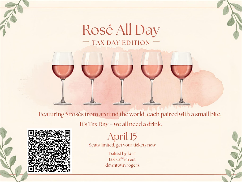 Join us at Baked by Kori on April 15th for a special Rosé Around the World Wine Tasting. Since its Tax Day, were giving everyone the perfect excuse to unwind with wine.