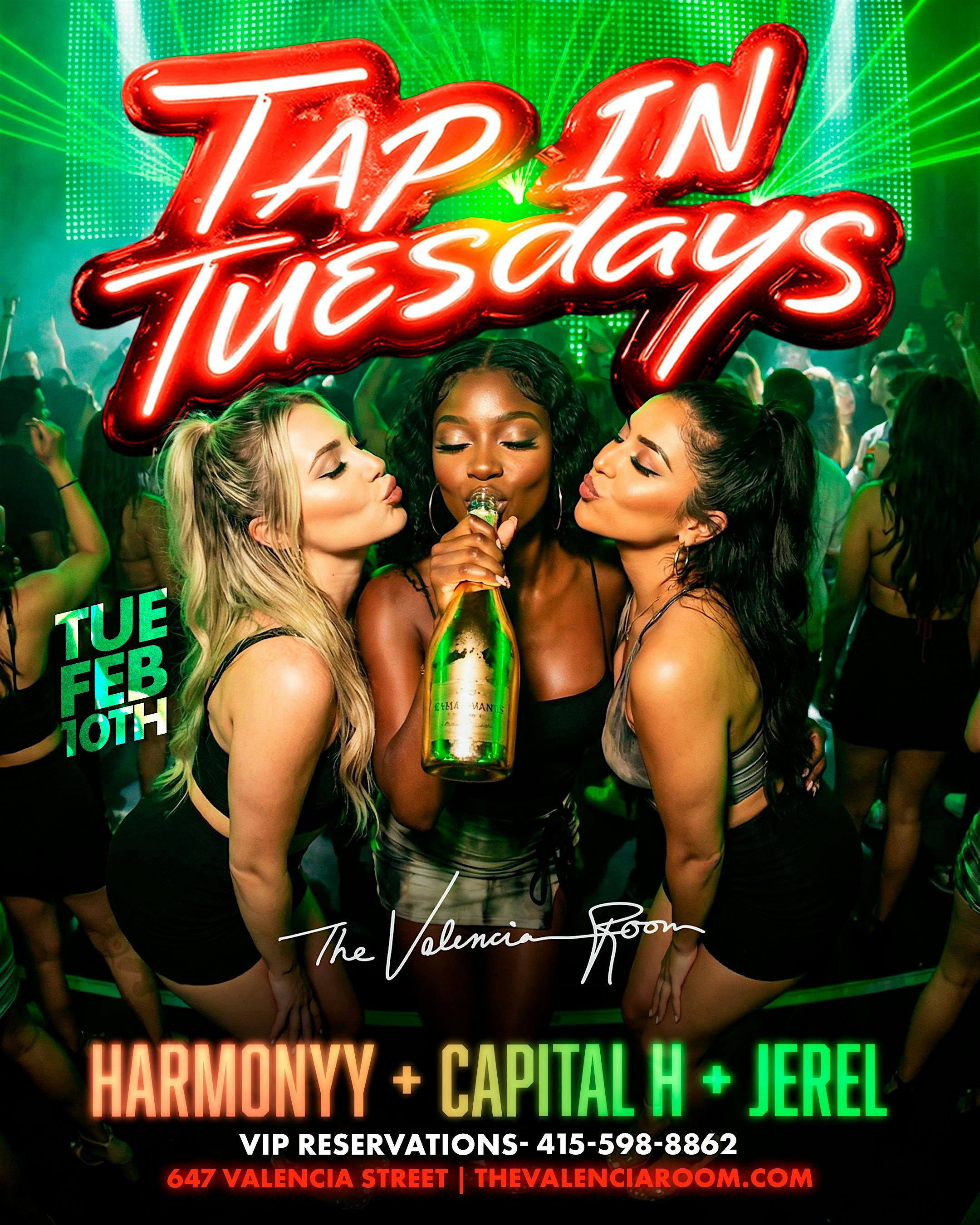 by admin13Feb TAP IN TUESDAYS at The Valencia Room – SAN FRANCISCO, CA TAP IN TUESDAYS at The Valencia Room – SAN FRANCISCO, CA 1 1 people viewed this event. Hip Hop / R&B / Reggaeton – Every Tues Nite! Tickets-RSVP Link Date And Time Wednesday, April 15th, 2026 05:00 AM (PST) Venue The Valencia Room Location 647 Valencia Street, SAN FRANCISCO, CA 94110 Event Types MusicParty or Social Gathering Event Category CaliforniaSan Francisco Share With Friends Facebook Twitter Linkedin Xing Pinterest Share This Post:
